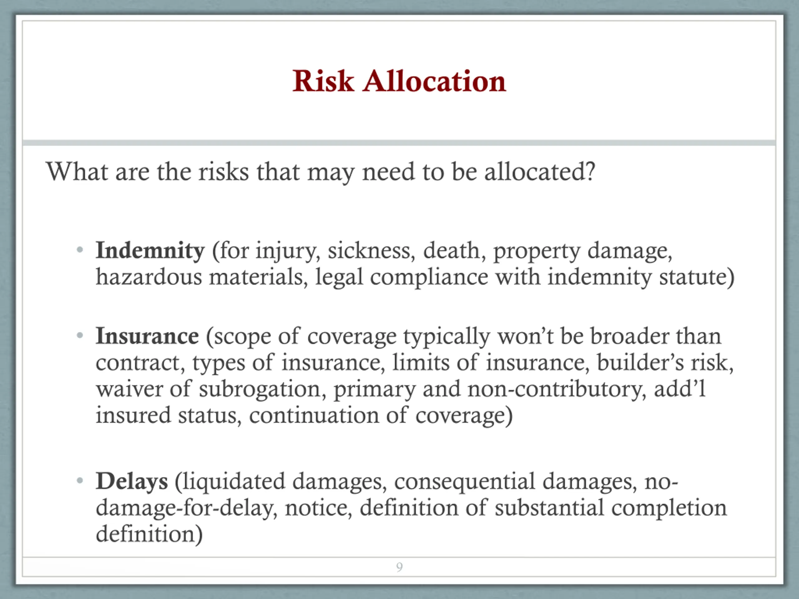 Risk Allocation What are the risks that may need to be allocated? Indemnity (for injury, sickness, death, property damage, hazardous materials, legal compliance with indemnity statute) Insurance(scope of coverage typically won t be broader than contract, types of insurance, limits of insurance, builder s risk, waiver of subrogation, primary and non-contributory, add l insured status, continuation of coverage) Delays (liquidated damages, consequential damages, no- damage-for-delay, notice, definition of substantial completion definition) 9