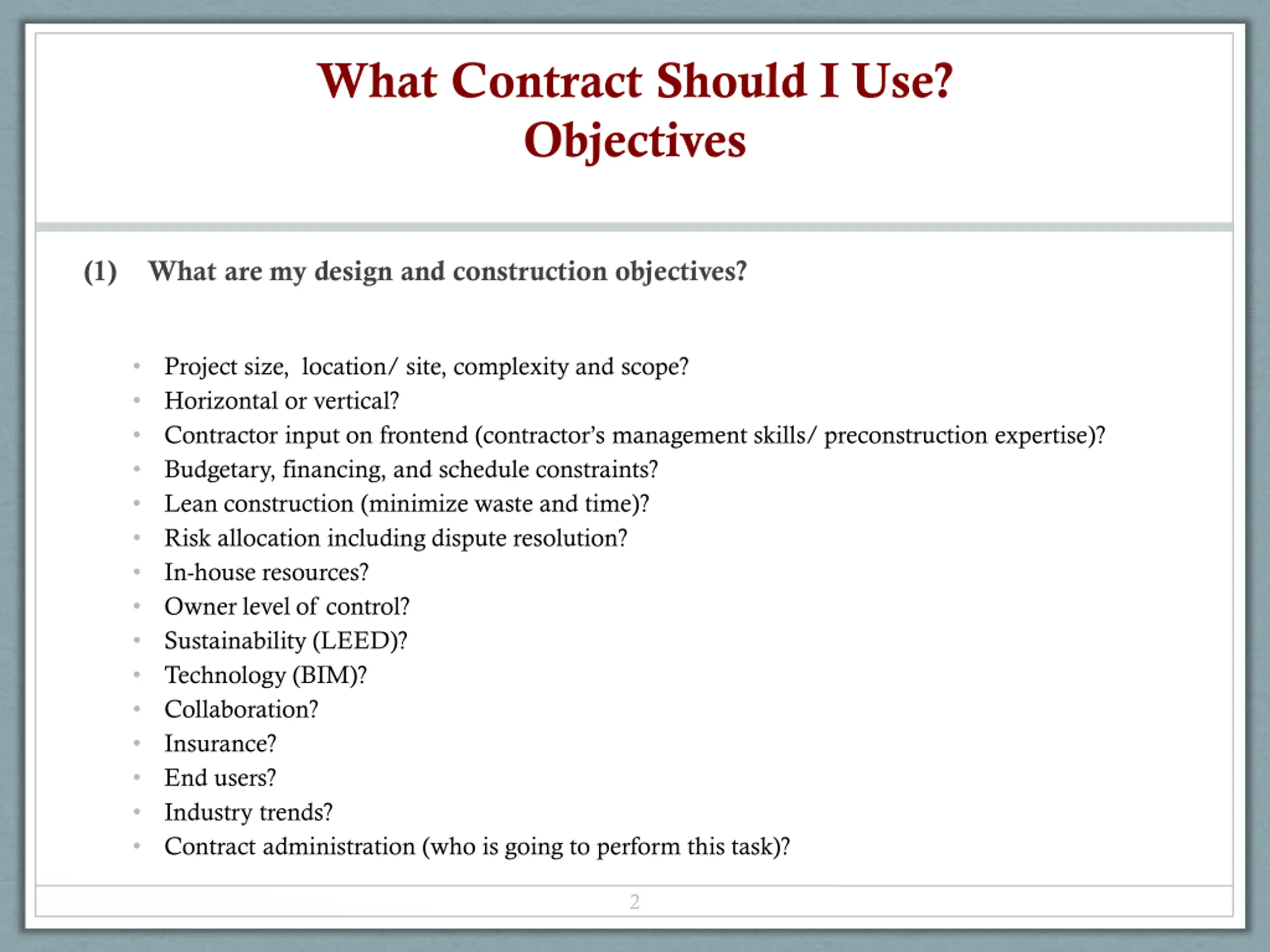 What Contract Should I Use? Objectives (1) What are my design and construction objectives? Project size, location/ site, complexity and scope? Horizontal or vertical? Contractor input on frontend (contractor s management skills/ preconstruction expertise)? Budgetary, financing, and schedule constraints? Lean construction (minimize waste and time)? Risk allocation including dispute resolution? In-house resources? Owner level of control? Sustainability (LEED)? Technology (BIM)? Collaboration? Insurance? End users? Industry trends? Contract administration (who is going to perform this task)? 2