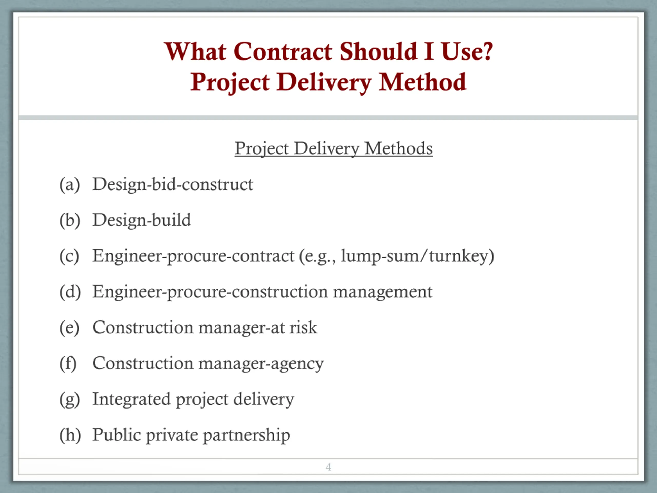 What Contract Should I Use? Project Delivery Method Project Delivery Methods (a) Design-bid-construct (b) Design-build (c) Engineer-procure-contract (e.g., lump-sum/turnkey) (d) Engineer-procure-construction management (e) Construction manager-at risk (f) Construction manager-agency (g) Integrated project delivery (h) Public private partnership 4