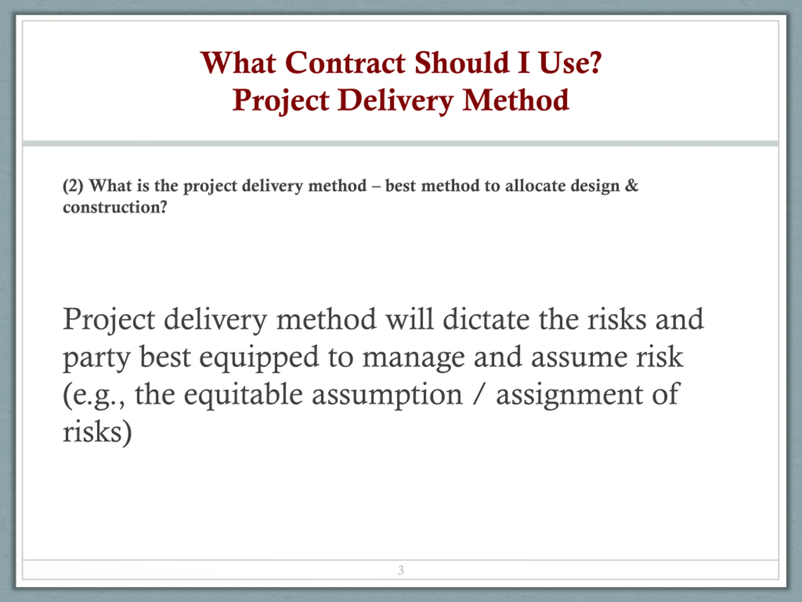 What Contract Should I Use? Project Delivery Method (2) What is the project delivery method best method to allocate design & construction? Project delivery method will dictate the risks and party best equipped to manage and assume risk (e.g., the equitable assumption / assignment of risks) 3