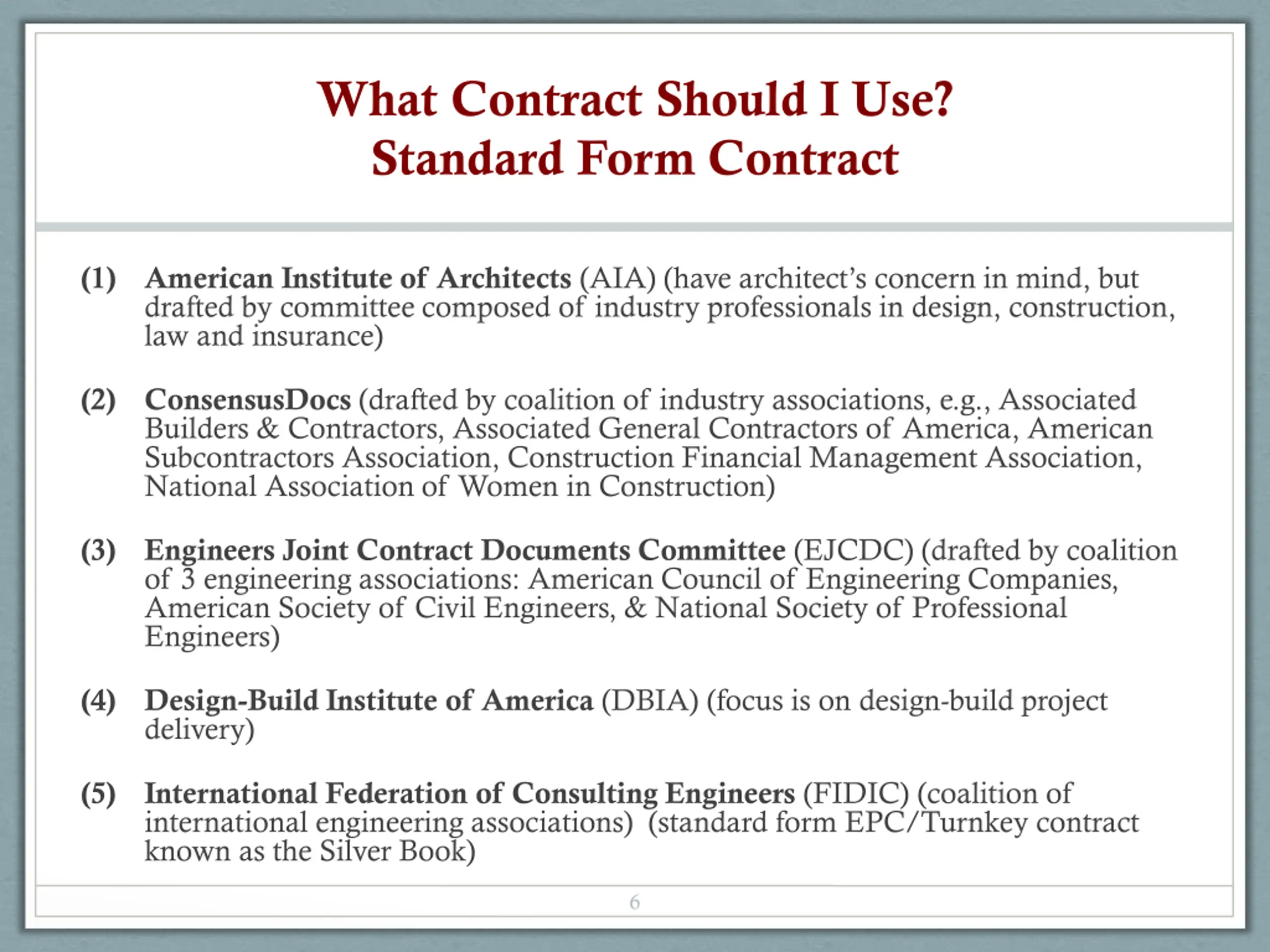What Contract Should I Use? Standard Form Contract American Institute of Architects (AIA) (have architect s concern in mind, but drafted by committee composed of industry professionals in design, construction, law and insurance) (1) ConsensusDocs (drafted by coalition of industry associations, e.g., Associated Builders & Contractors, Associated General Contractors of America, American Subcontractors Association, Construction Financial Management Association, National Association of Women in Construction) (2) Engineers Joint Contract Documents Committee (EJCDC) (drafted by coalition of 3 engineering associations: American Council of Engineering Companies, American Society of Civil Engineers, & National Society of Professional Engineers) (3) Design-Build Institute of America (DBIA) (focus is on design-build project delivery) (4) International Federation of Consulting Engineers (FIDIC) (coalition of international engineering associations) (standard form EPC/Turnkey contract known as the Silver Book) (5) 6
