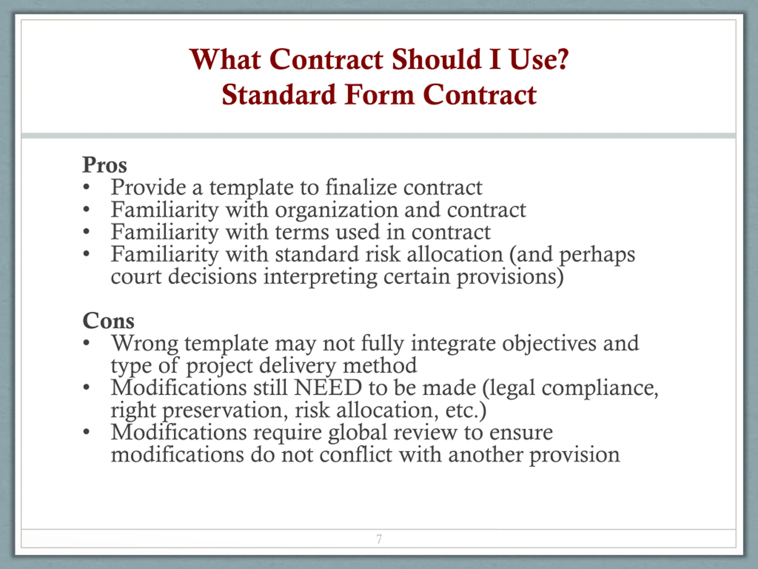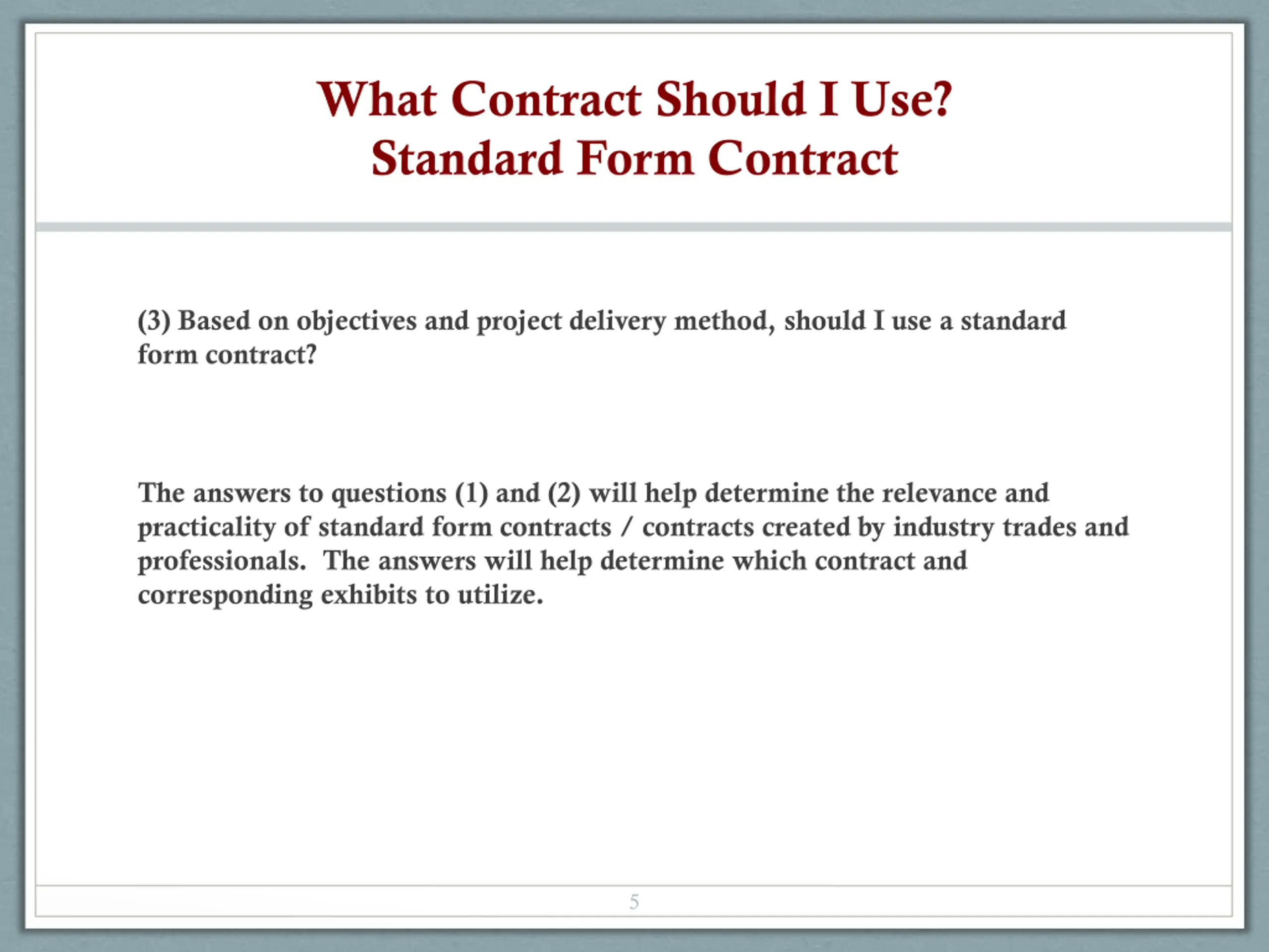 What Contract Should I Use? Standard Form Contract (3) Based on objectives and project delivery method, should I use a standard form contract? The answers to questions (1) and (2) will help determine the relevance and practicality of standard form contracts / contracts created by industry trades and professionals. The answers will help determine which contract and corresponding exhibits to utilize. 5
