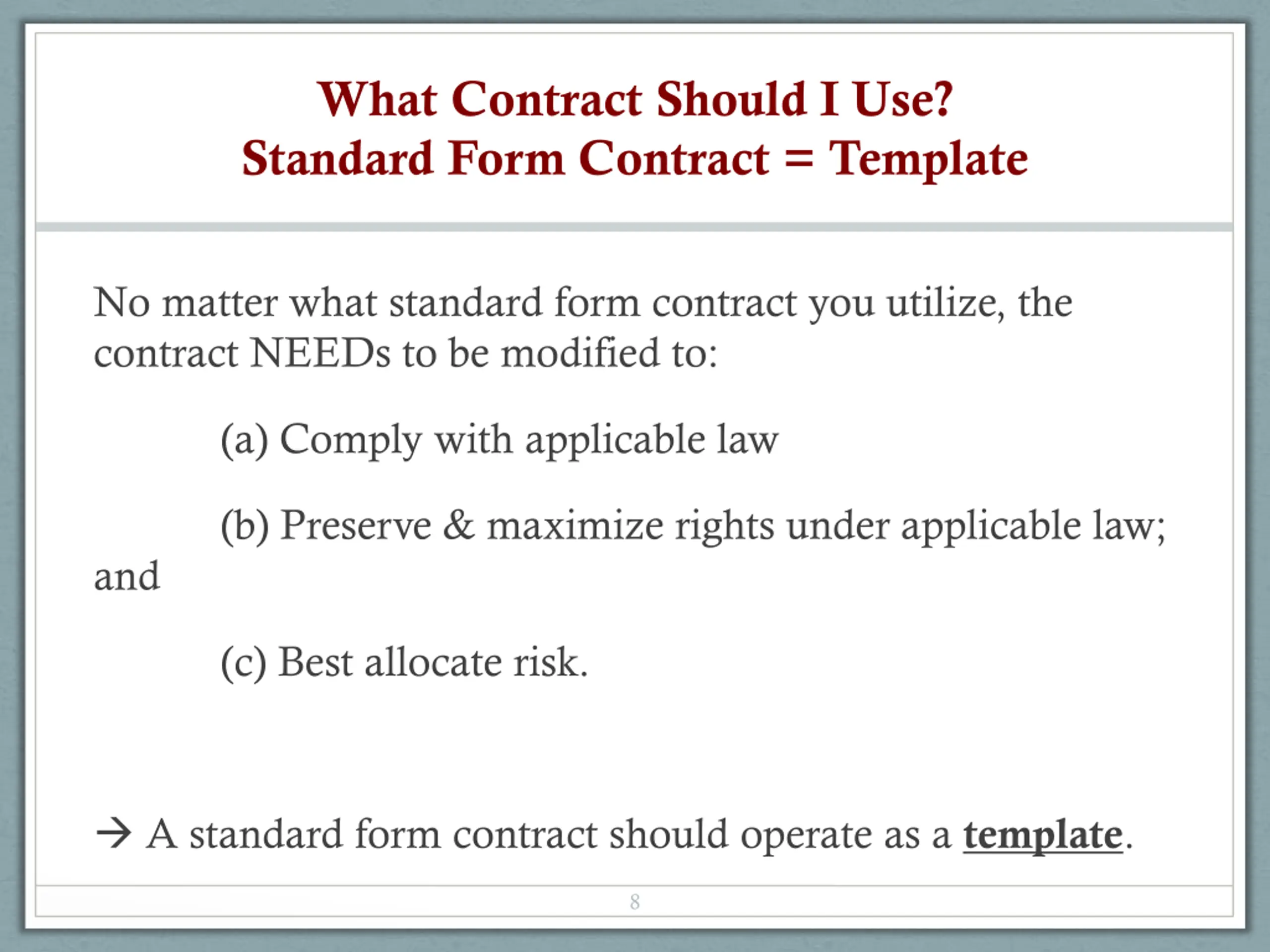 What Contract Should I Use? Standard Form Contract = Template No matter what standard form contract you utilize, the contract NEEDs to be modified to: (a) Comply with applicable law and (b) Preserve & maximize rights under applicable law; (c) Best allocate risk. A standard form contract should operate as a template. 8