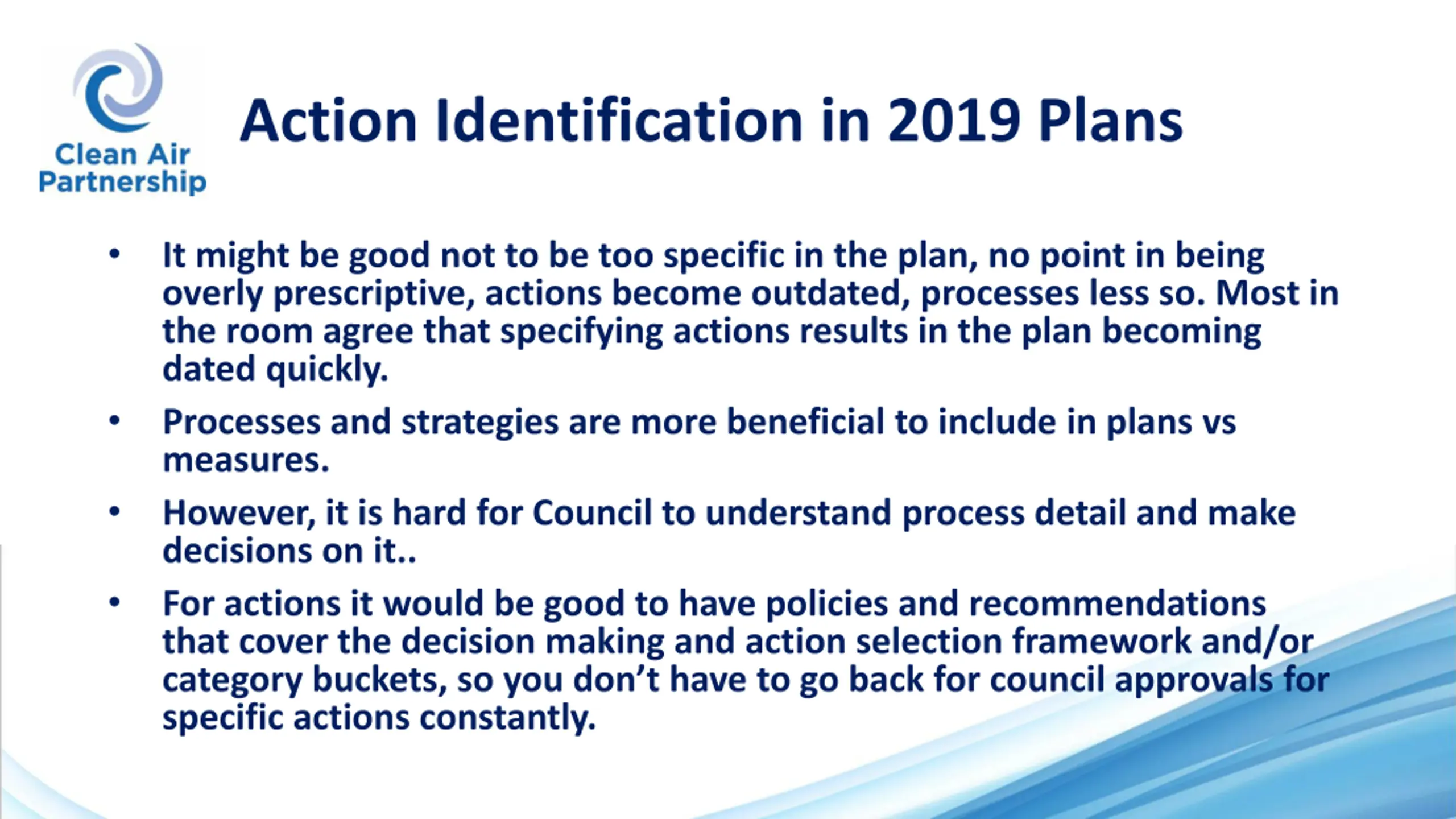 Action Identification in 2019 Plans It might be good not to be too specific in the plan, no point in being overly prescriptive, actions become outdated, processes less so. Most in the room agree that specifying actions results in the plan becoming dated quickly. Processes and strategies are more beneficial to include in plans vs measures. However, it is hard for Council to understand process detail and make decisions on it.. For actions it would be good to have policies and recommendations that cover the decision making and action selection framework and/or category buckets, so you don t have to go back for council approvals for specific actions constantly.