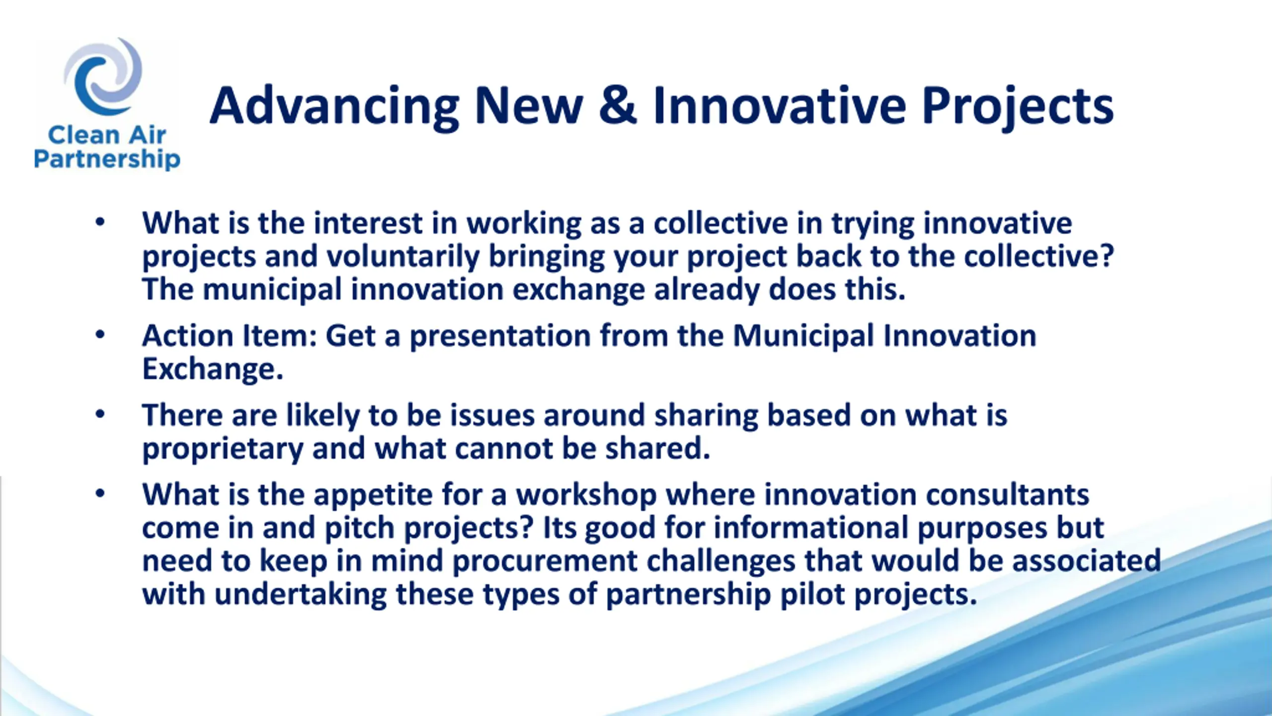 Advancing New & Innovative Projects What is the interest in working as a collective in trying innovative projects and voluntarily bringing your project back to the collective? The municipal innovation exchange already does this. Action Item: Get a presentation from the Municipal Innovation Exchange. There are likely to be issues around sharing based on what is proprietary and what cannot be shared. What is the appetite for a workshop where innovation consultants come in and pitch projects? Its good for informational purposes but need to keep in mind procurement challenges that would be associated with undertaking these types of partnership pilot projects.