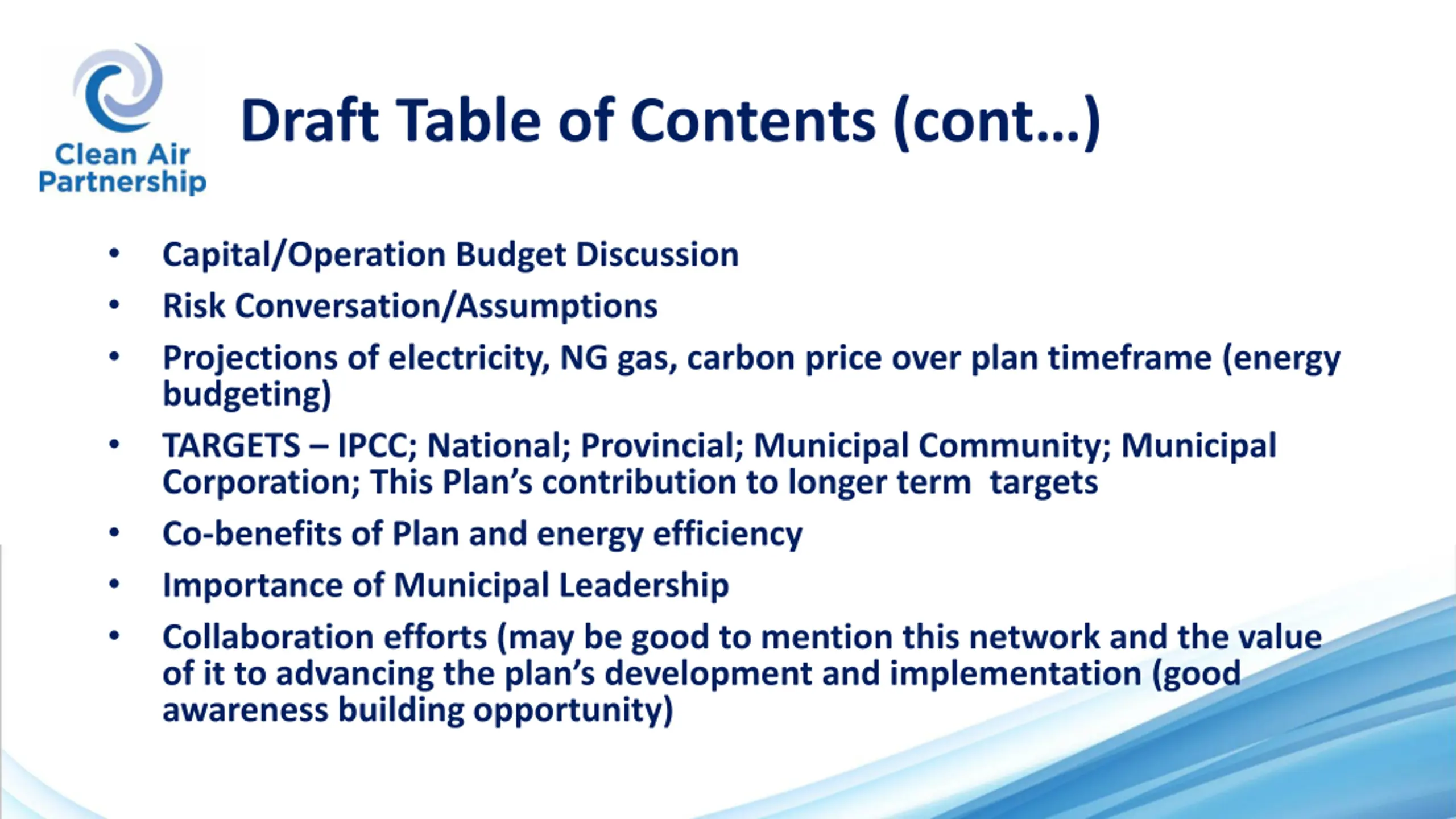 Draft Table of Contents (cont) Capital/Operation Budget Discussion Risk Conversation/Assumptions Projections of electricity, NG gas, carbon price over plan timeframe (energy budgeting) TARGETS IPCC; National; Provincial; Municipal Community; Municipal Corporation; This Plan s contribution to longer term targets Co-benefits of Plan and energy efficiency Importance of Municipal Leadership Collaboration efforts (may be good to mention this network and the value of it to advancing the plan s development and implementation (good awareness building opportunity)