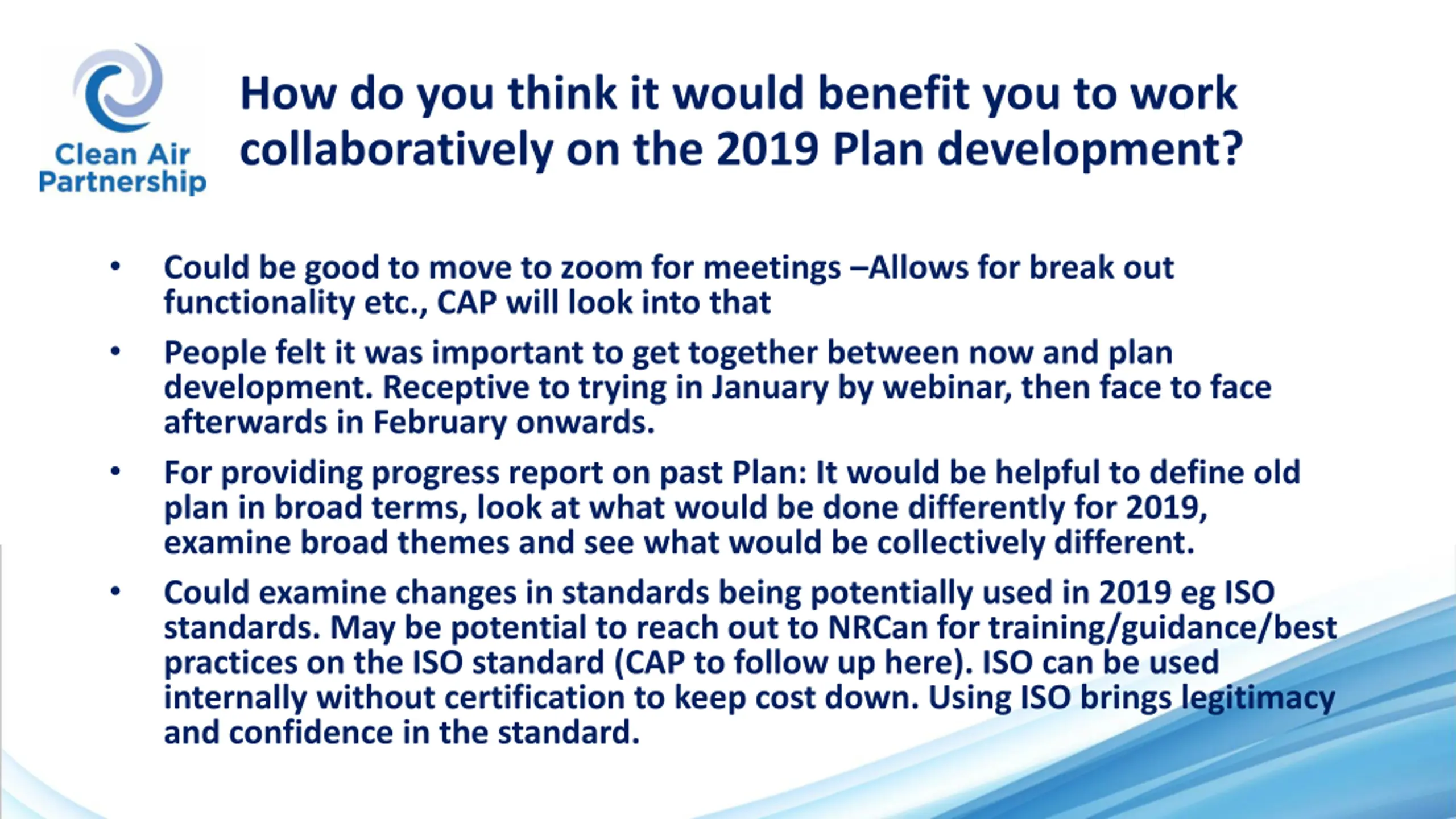 How do you think it would benefit you to work collaboratively on the 2019 Plan development? Could be good to move to zoom for meetings Allows for break out functionality etc., CAP will look into that People felt it was important to get together between now and plan development. Receptive to trying in January by webinar, then face to face afterwards in February onwards. For providing progress report on past Plan: It would be helpful to define old plan in broad terms, look at what would be done differently for 2019, examine broad themes and see what would be collectively different. Could examine changes in standards being potentially used in 2019 eg ISO standards. May be potential to reach out to NRCan for training/guidance/best practices on the ISO standard (CAP to follow up here). ISO can be used internally without certification to keep cost down. Using ISO brings legitimacy and confidence in the standard.