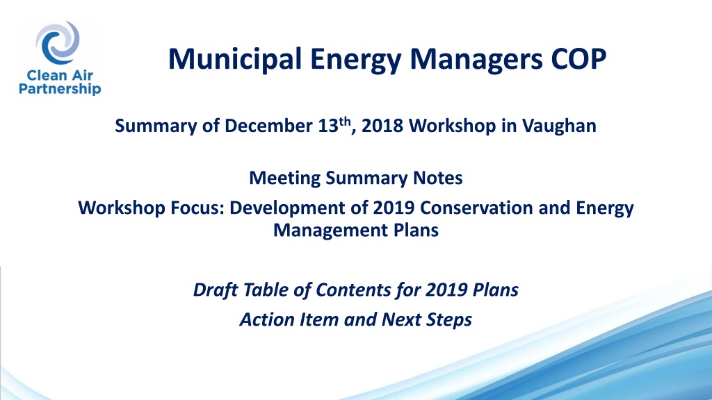 Municipal Energy Managers COP Summary of December 13th, 2018 Workshop in Vaughan Meeting Summary Notes Workshop Focus: Development of 2019 Conservation and Energy Management Plans Draft Table of Contents for 2019 Plans Action Item and Next Steps