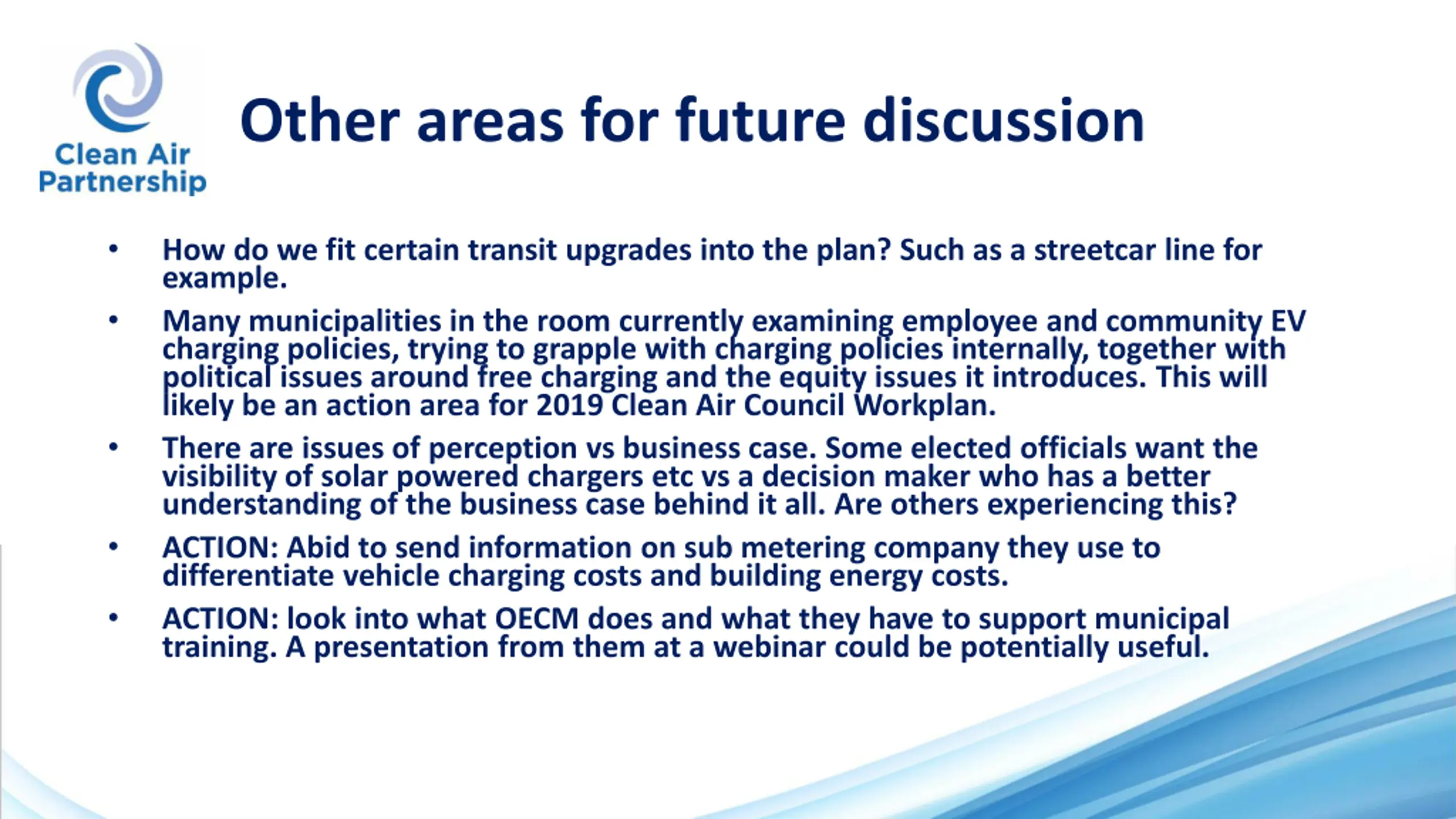 Other areas for future discussion How do we fit certain transit upgrades into the plan? Such as a streetcar line for example. Many municipalities in the room currently examining employee and community EV charging policies, trying to grapple with charging policies internally, together with political issues around free charging and the equity issues it introduces. This will likely be an action area for 2019 Clean Air Council Workplan. There are issues of perception vs business case. Some elected officials want the visibility of solar powered chargers etc vs a decision maker who has a better understanding of the business case behind it all. Are others experiencing this? ACTION: Abid to send information on sub metering company they use to differentiate vehicle charging costs and building energy costs. ACTION: look into what OECM does and what they have to support municipal training. A presentation from them at a webinar could be potentially useful.