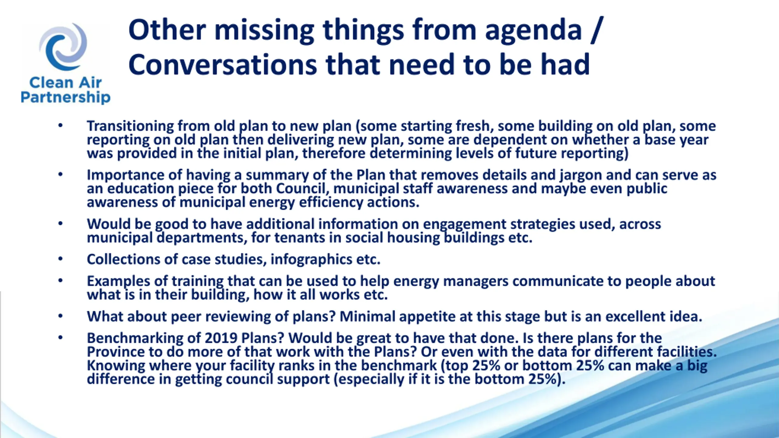 Other missing things from agenda / Conversations that need to be had Transitioning from old plan to new plan (some starting fresh, some building on old plan, some reporting on old plan then delivering new plan, some are dependent on whether a base year was provided in the initial plan, therefore determining levels of future reporting) Importance of having a summary of the Plan that removes details and jargon and can serve as an education piece for both Council, municipal staff awareness and maybe even public awareness of municipal energy efficiency actions. Would be good to have additional information on engagement strategies used, across municipal departments, for tenants in social housing buildings etc. Collections of case studies, infographics etc. Examples of training that can be used to help energy managers communicate to people about what is in their building, how it all works etc. What about peer reviewing of plans? Minimal appetite at this stage but is an excellent idea. Benchmarking of 2019 Plans? Would be great to have that done. Is there plans for the Province to do more of that work with the Plans? Or even with the data for different facilities. Knowing where your facility ranks in the benchmark (top 25% or bottom 25% can make a big difference in getting council support (especially if it is the bottom 25%).