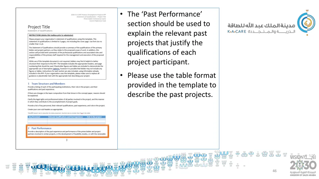 The Past Performance section should be used to explain the relevant past projects that justify the qualifications of each project participant. Please use the table format provided in the template to describe the past projects. 46