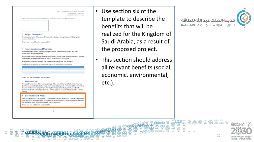 Use section six of the template to describe the benefits that will be realized for the Kingdom of Saudi Arabia, as a result of the proposed project. This section should address all relevant benefits (social, economic, environmental, etc.). 20