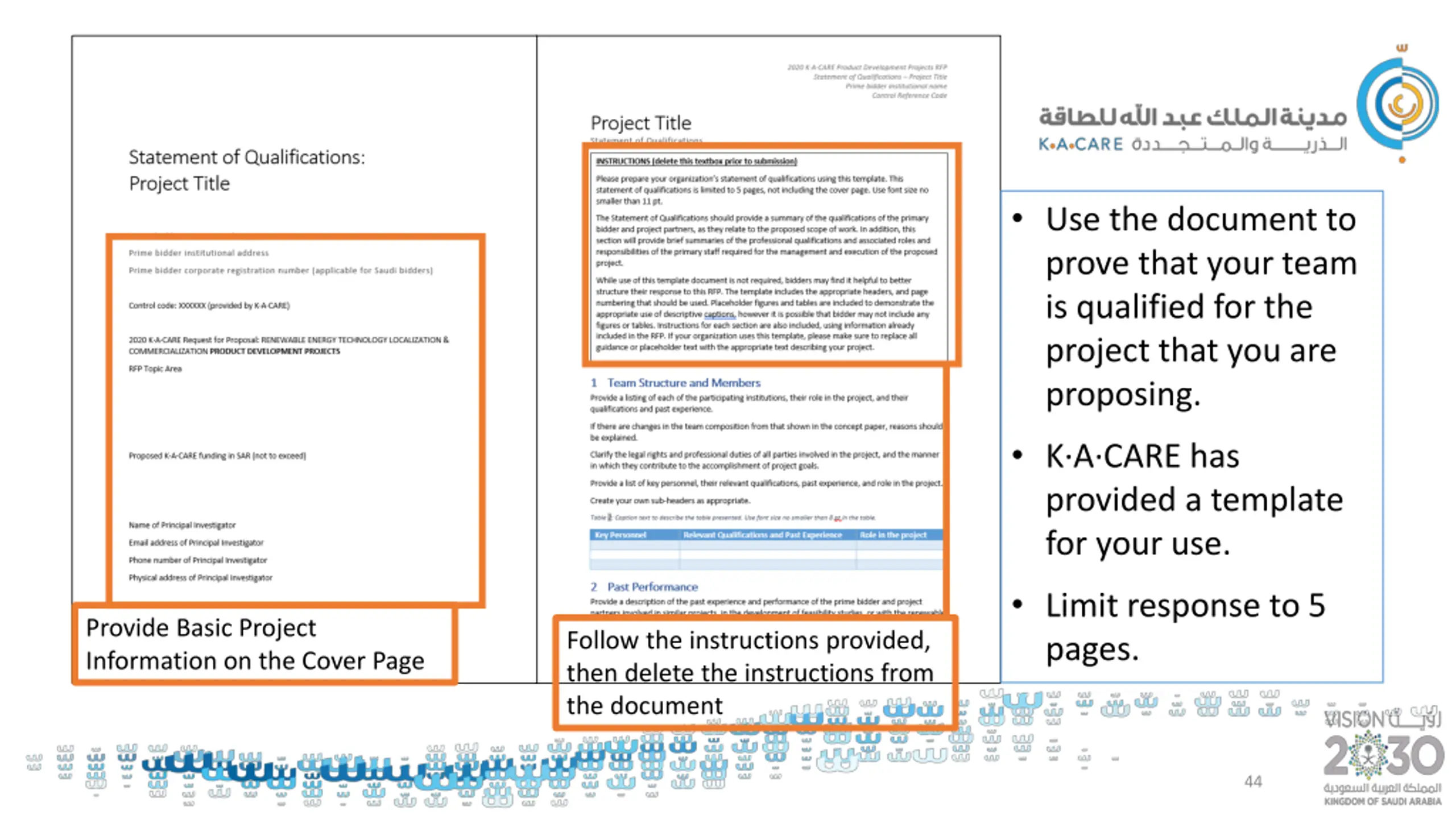 Use the document to prove that your team is qualified for the project that you are proposing. K A CARE has provided a template for your use. Limit response to 5 pages. Provide Basic Project Information on the Cover Page Follow the instructions provided, then delete the instructions from the document 44