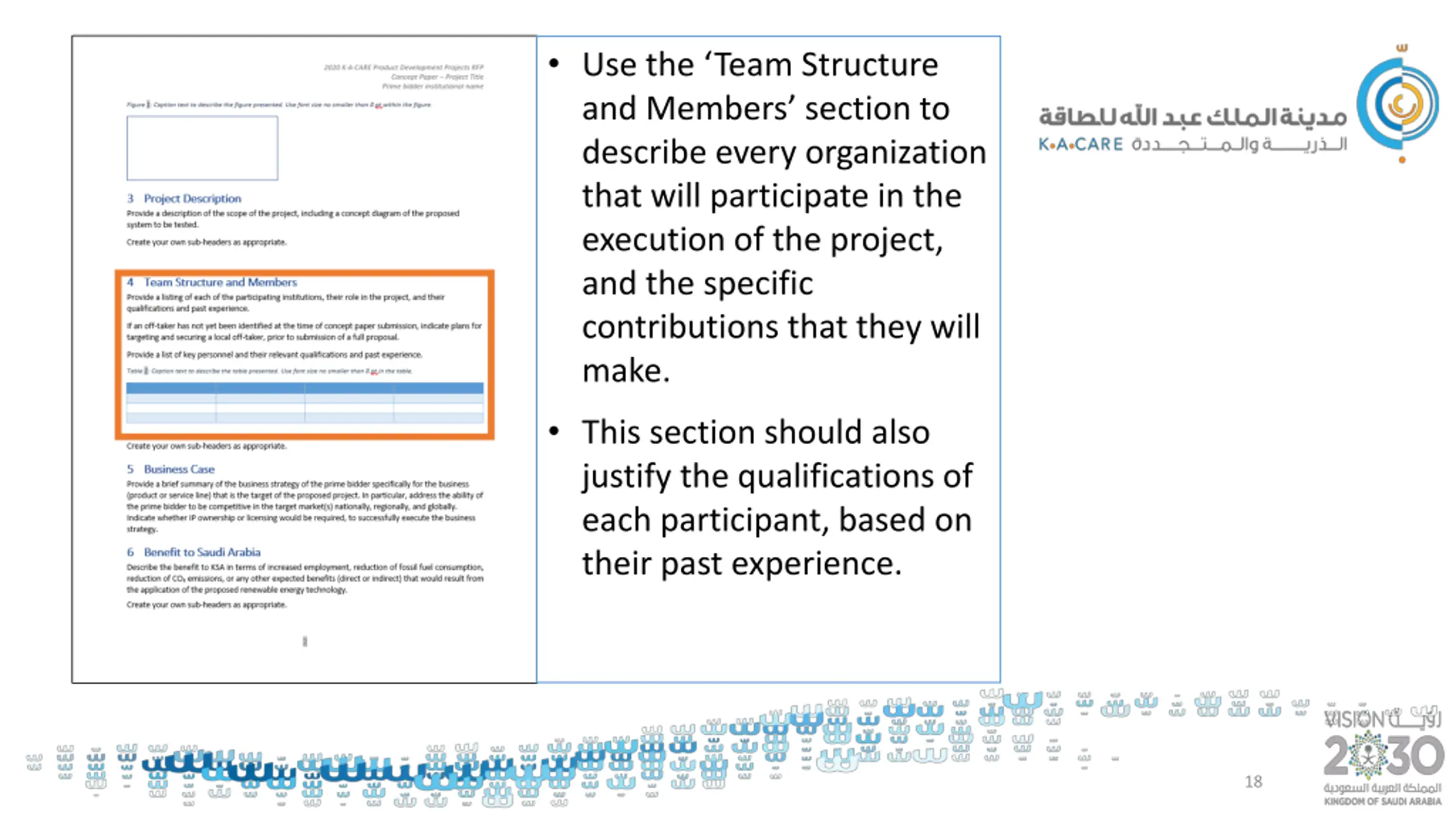 Use the Team Structure and Members section to describe every organization that will participate in the execution of the project, and the specific contributions that they will make. This section should also justify the qualifications of each participant, based on their past experience. 18