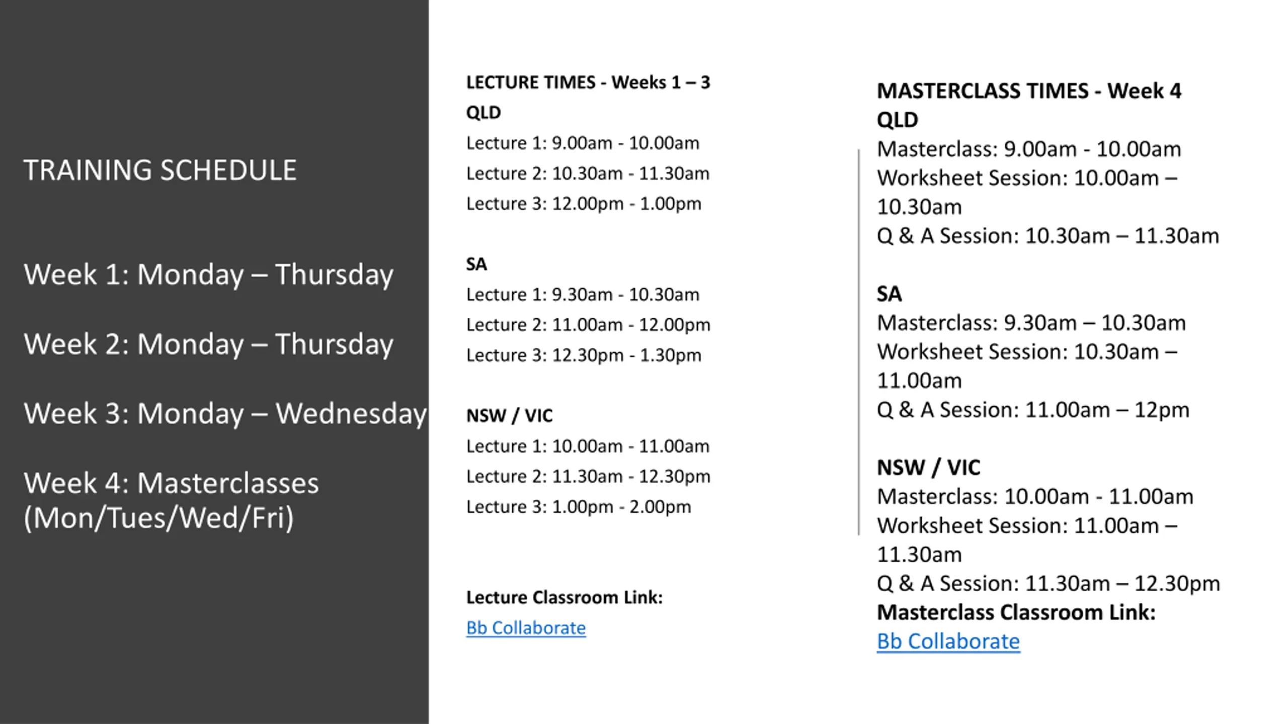 LECTURE TIMES - Weeks 1 3 MASTERCLASS TIMES - Week 4 QLD Masterclass: 9.00am - 10.00am Worksheet Session: 10.00am 10.30am Q & A Session: 10.30am 11.30am QLD Lecture 1: 9.00am - 10.00am TRAINING SCHEDULE Lecture 2: 10.30am - 11.30am Lecture 3: 12.00pm - 1.00pm SA Week 1: Monday Thursday SA Masterclass: 9.30am 10.30am Worksheet Session: 10.30am 11.00am Q & A Session: 11.00am 12pm Lecture 1: 9.30am - 10.30am Lecture 2: 11.00am - 12.00pm Week 2: Monday Thursday Lecture 3: 12.30pm - 1.30pm Week 3: Monday Wednesday NSW / VIC Lecture 1: 10.00am - 11.00am NSW / VIC Masterclass: 10.00am - 11.00am Worksheet Session: 11.00am 11.30am Q & A Session: 11.30am 12.30pm Masterclass Classroom Link: Bb Collaborate Lecture 2: 11.30am - 12.30pm Week 4: Masterclasses (Mon/Tues/Wed/Fri) Lecture 3: 1.00pm - 2.00pm Lecture Classroom Link: Bb Collaborate