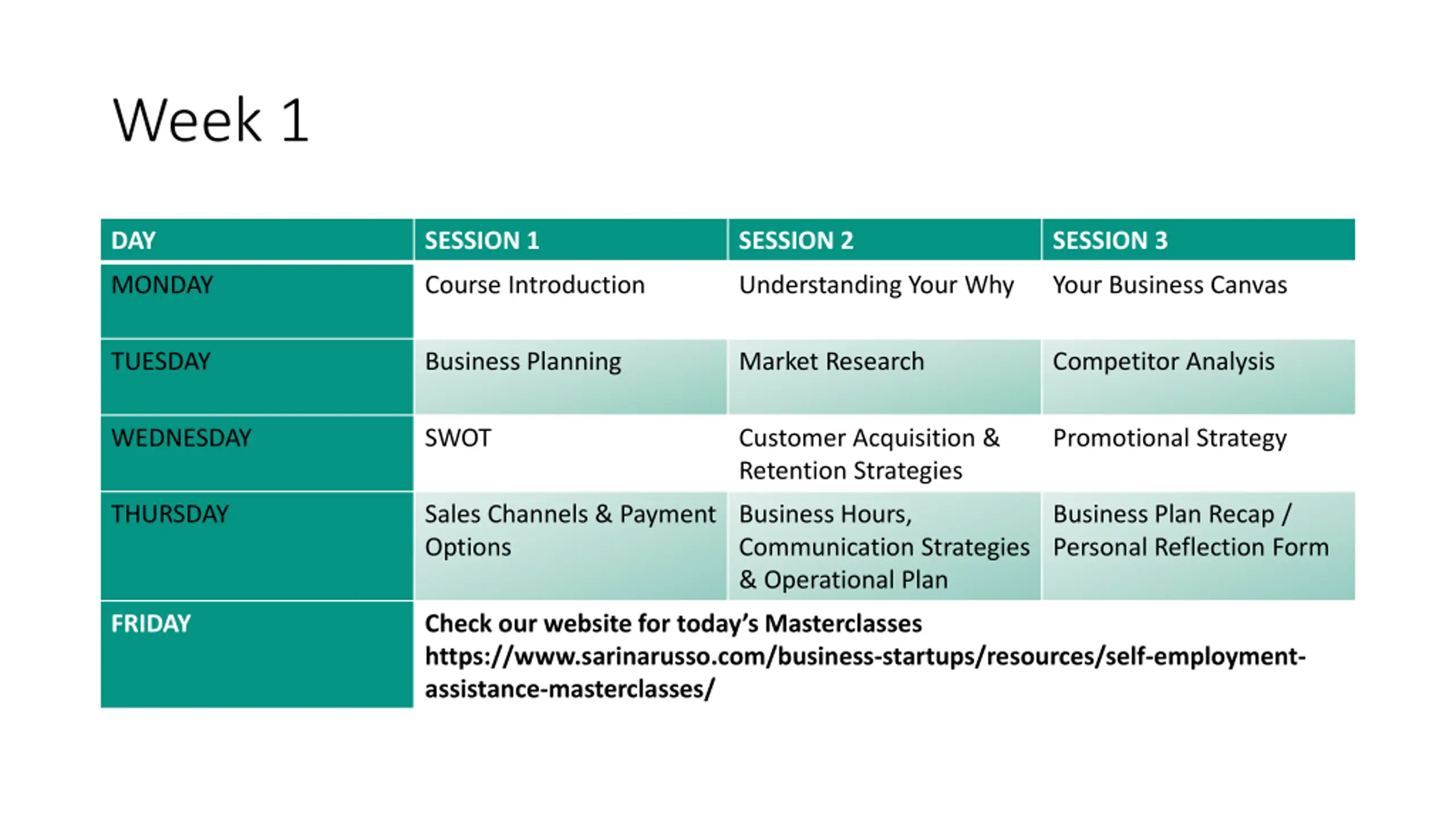 Week 1 DAY SESSION 1 SESSION 2 SESSION 3 MONDAY Course Introduction Understanding Your Why Your Business Canvas TUESDAY Business Planning Market Research Competitor Analysis WEDNESDAY SWOT Customer Acquisition & Retention Strategies Promotional Strategy THURSDAY Sales Channels & Payment Options Business Hours, Communication Strategies & Operational Plan Business Plan Recap / Personal Reflection Form FRIDAY Check our website for today s Masterclasses https://www.sarinarusso.com/business-startups/resources/self-employment- assistance-masterclasses/