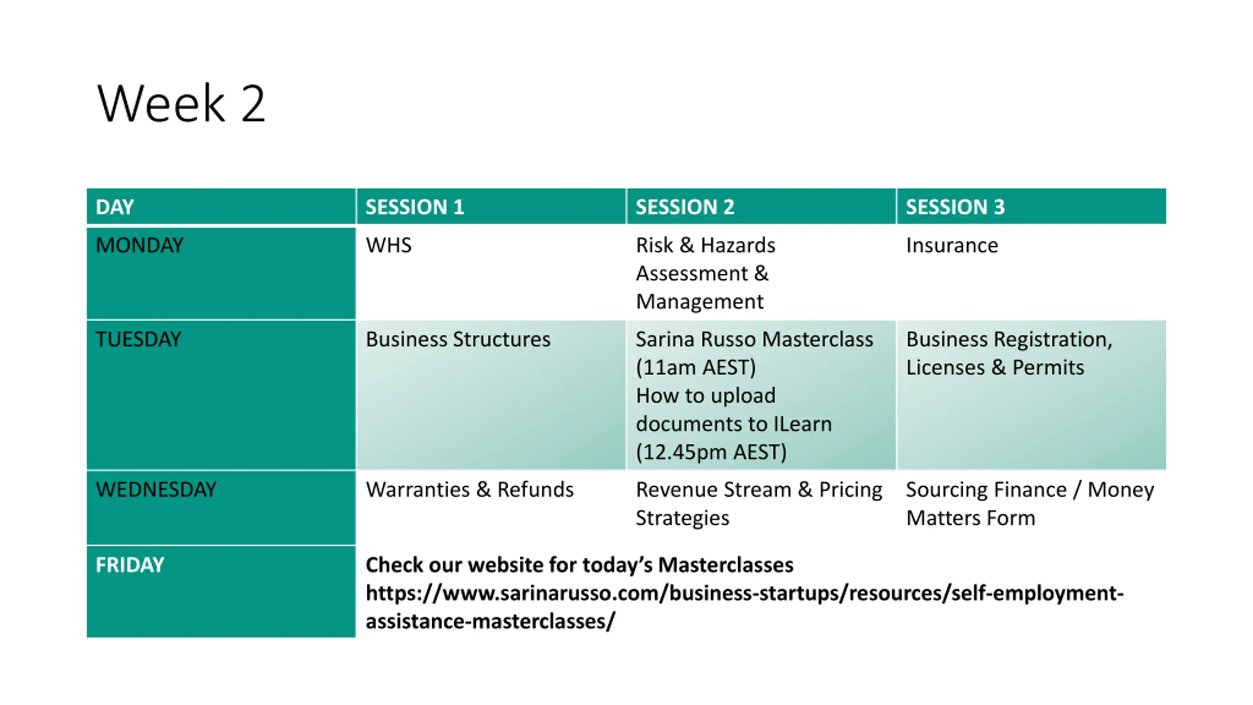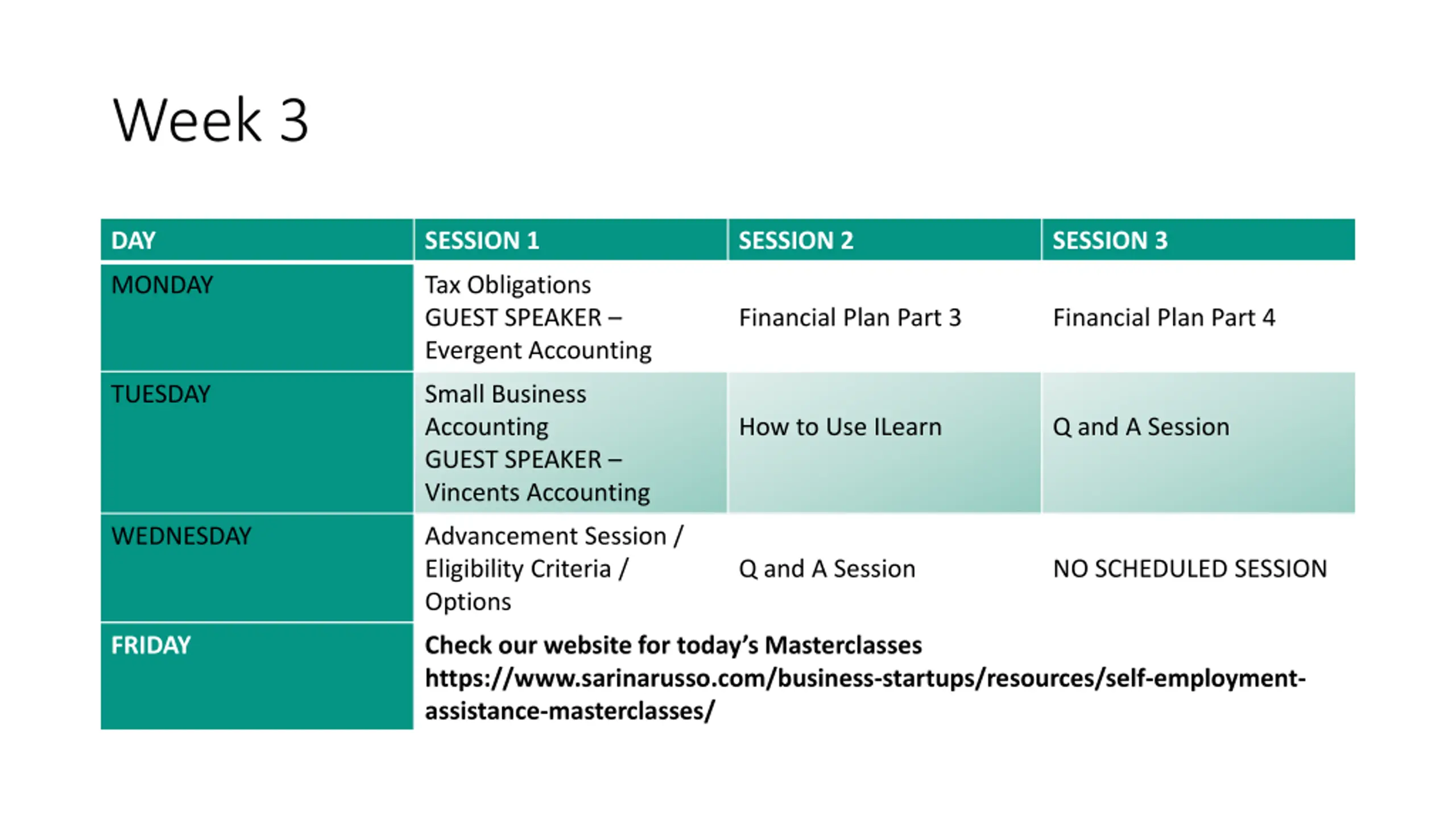 Week 3 DAY SESSION 1 SESSION 2 SESSION 3 MONDAY Tax Obligations GUEST SPEAKER Evergent Accounting Financial Plan Part 3 Financial Plan Part 4 TUESDAY Small Business Accounting GUEST SPEAKER Vincents Accounting How to Use ILearn Q and A Session WEDNESDAY Advancement Session / Eligibility Criteria / Options Q and A Session NO SCHEDULED SESSION FRIDAY Check our website for today s Masterclasses https://www.sarinarusso.com/business-startups/resources/self-employment- assistance-masterclasses/