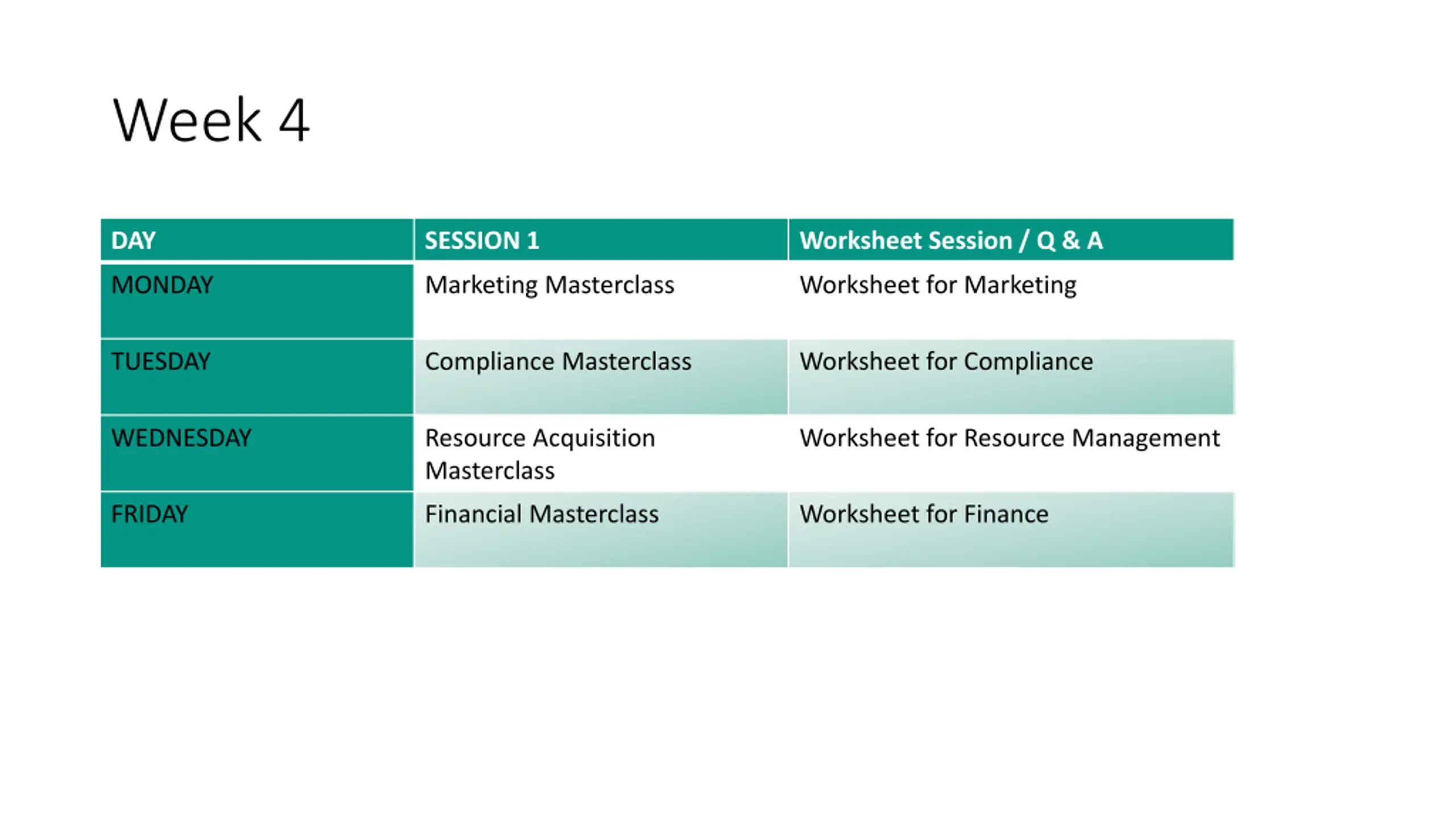 Week 4 DAY SESSION 1 Worksheet Session / Q & A MONDAY Marketing Masterclass Worksheet for Marketing TUESDAY Compliance Masterclass Worksheet for Compliance WEDNESDAY Resource Acquisition Masterclass Worksheet for Resource Management FRIDAY Financial Masterclass Worksheet for Finance