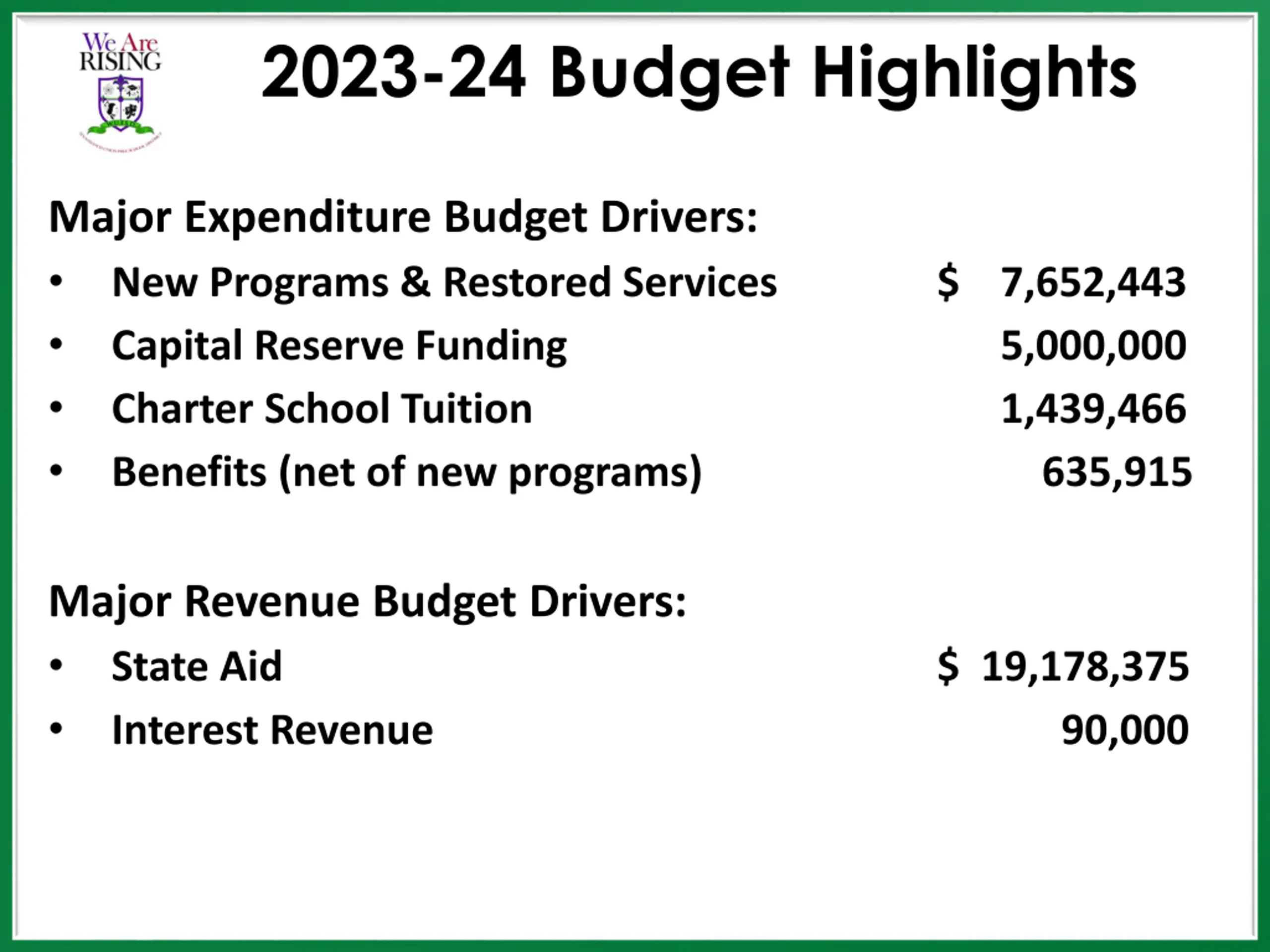 2023-24 Budget Highlights Major Expenditure Budget Drivers: New Programs & Restored Services Capital Reserve Funding Charter School Tuition Benefits (net of new programs) $ 7,652,443 5,000,000 1,439,466 635,915 Major Revenue Budget Drivers: State Aid Interest Revenue $ 19,178,375 90,000