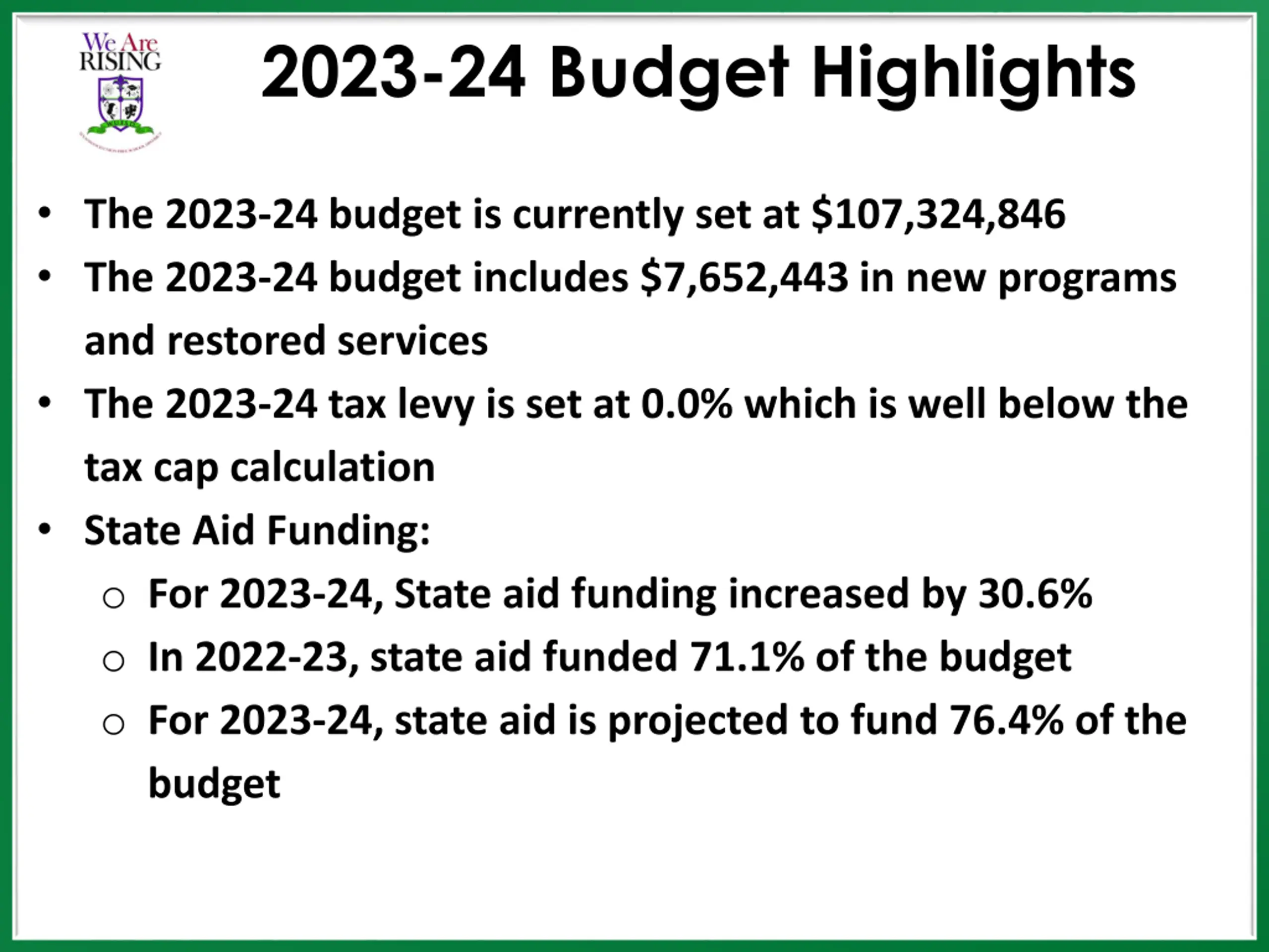 2023-24 Budget Highlights The 2023-24 budget is currently set at $107,324,846 The 2023-24 budget includes $7,652,443 in new programs and restored services The 2023-24 tax levy is set at 0.0% which is well below the tax cap calculation State Aid Funding: o For 2023-24, State aid funding increased by 30.6% o In 2022-23, state aid funded 71.1% of the budget o For 2023-24, state aid is projected to fund 76.4% of the budget