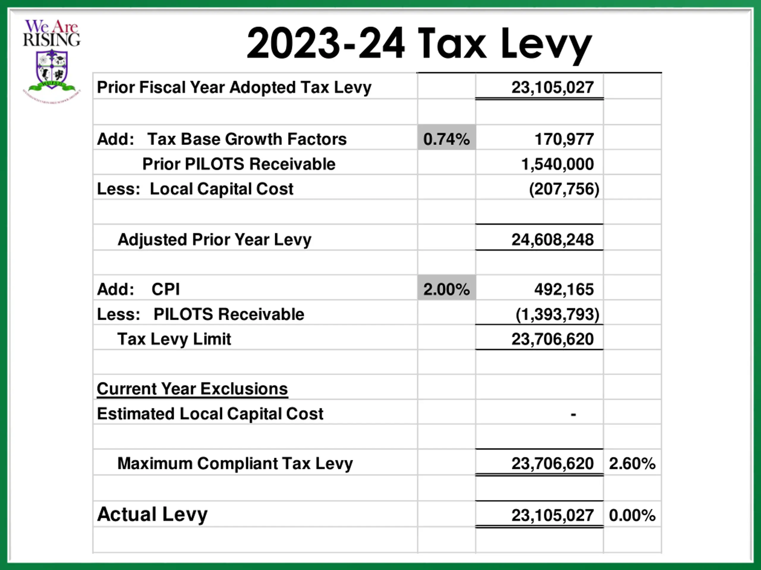 2023-24 Tax Levy Prior Fiscal Year Adopted Tax Levy 23,105,027 Add: Tax Base Growth Factors Prior PILOTS Receivable Less: Local Capital Cost 0.74% 170,977 1,540,000 (207,756) Adjusted Prior Year Levy 24,608,248 Add: CPI Less: PILOTS Receivable Tax Levy Limit 2.00% 492,165 (1,393,793) 23,706,620 Current Year Exclusions Estimated Local Capital Cost - Maximum Compliant Tax Levy 23,706,620 2.60% Actual Levy 23,105,027 0.00%
