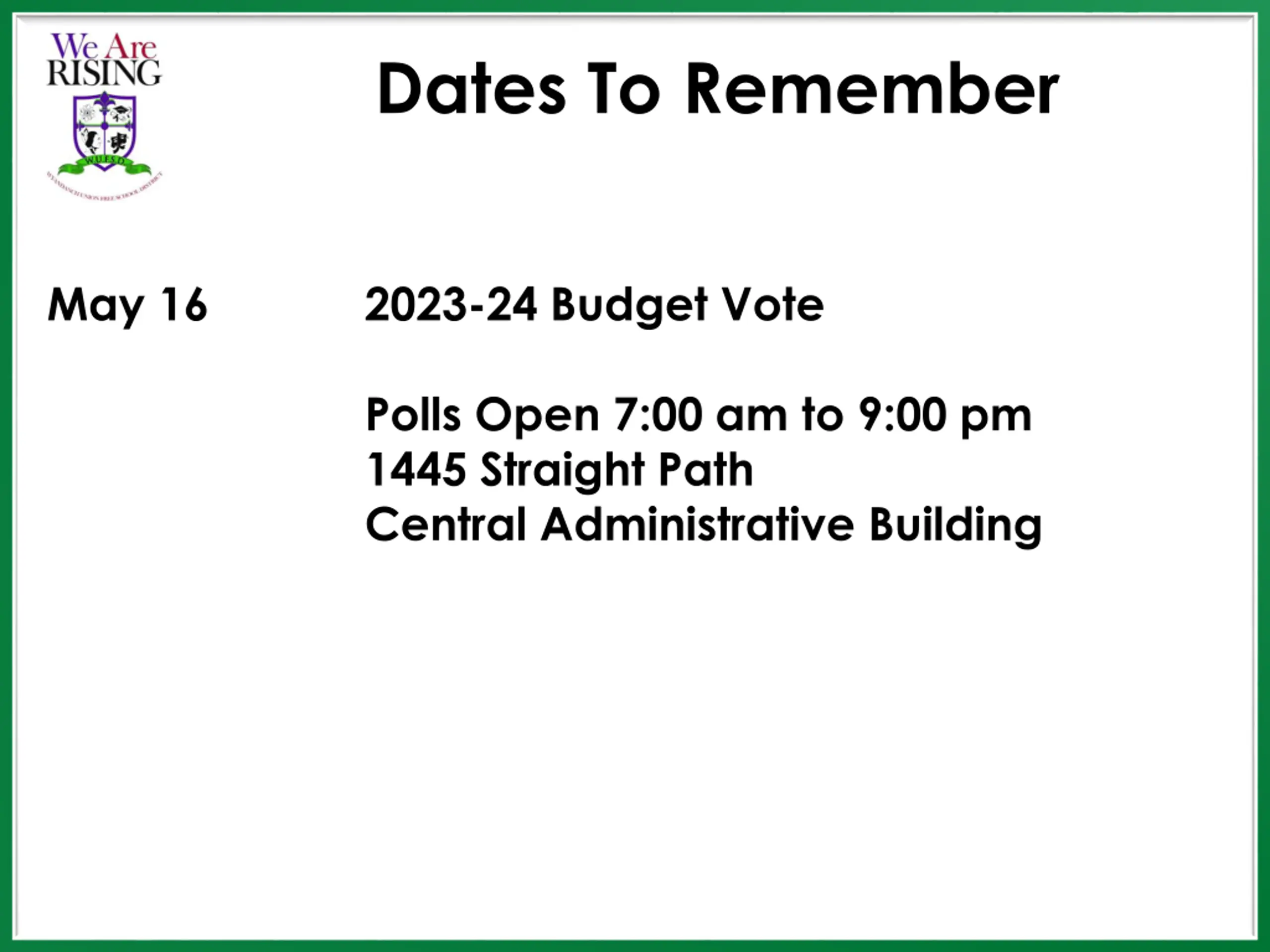 Dates To Remember May 16 2023-24 Budget Vote Polls Open 7:00 am to 9:00 pm 1445 Straight Path Central Administrative Building