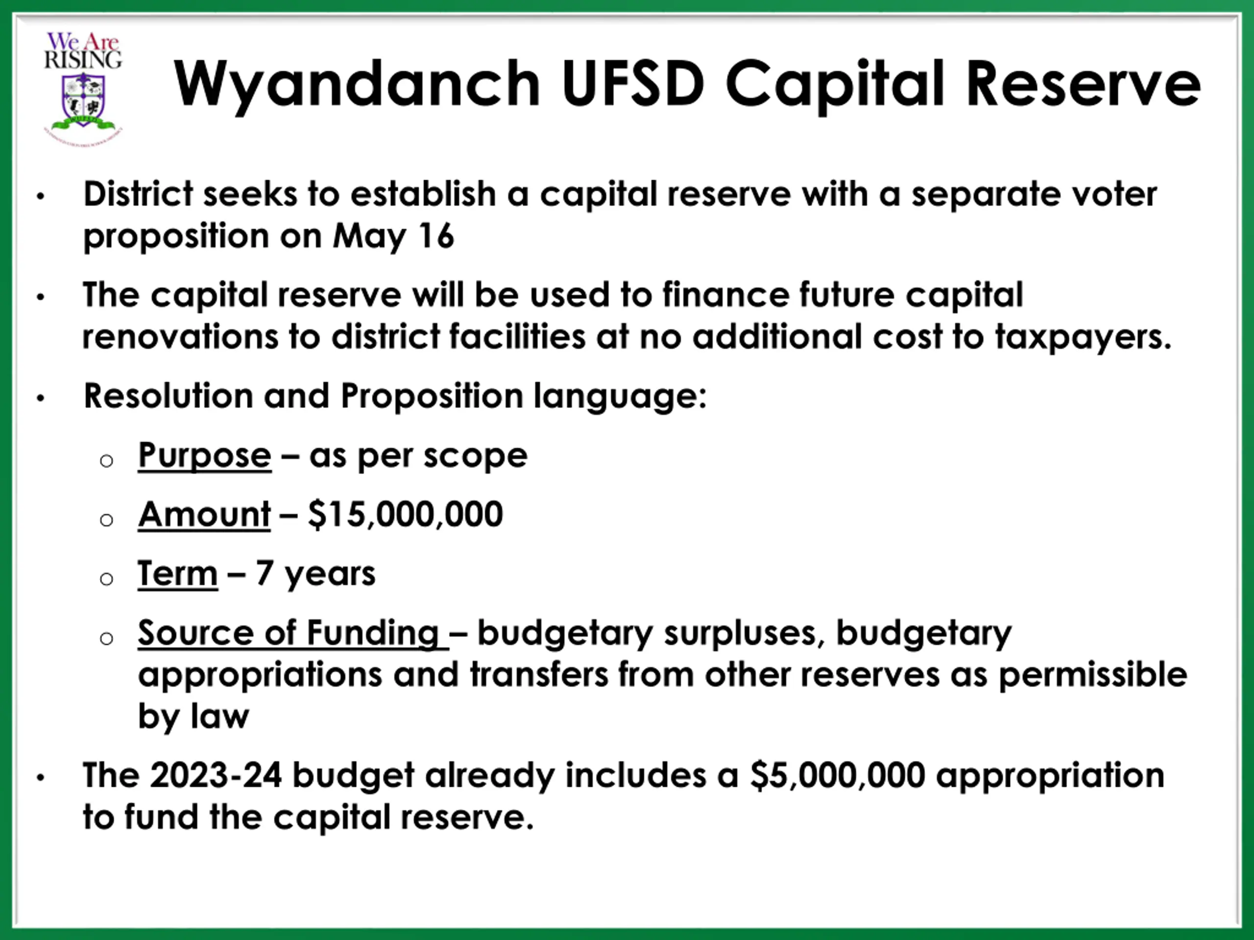 Wyandanch UFSD Capital Reserve District seeks to establish a capital reserve with a separate voter proposition on May 16 The capital reserve will be used to finance future capital renovations to district facilities at no additional cost to taxpayers. Resolution and Proposition language: o Purpose as per scope o Amount $15,000,000 o Term 7 years o Source of Funding budgetary surpluses, budgetary appropriations and transfers from other reserves as permissible by law The 2023-24 budget already includes a $5,000,000 appropriation to fund the capital reserve.