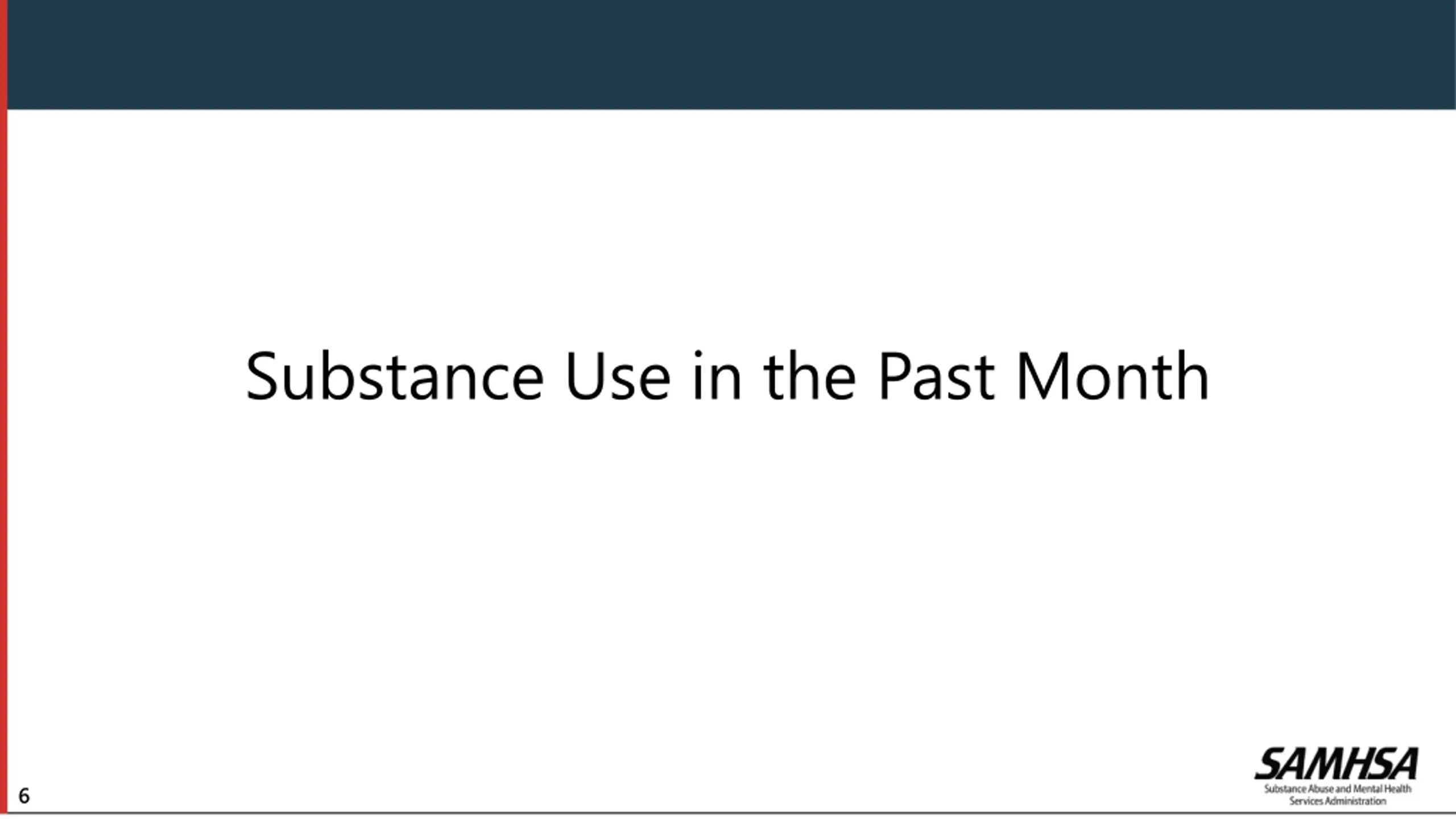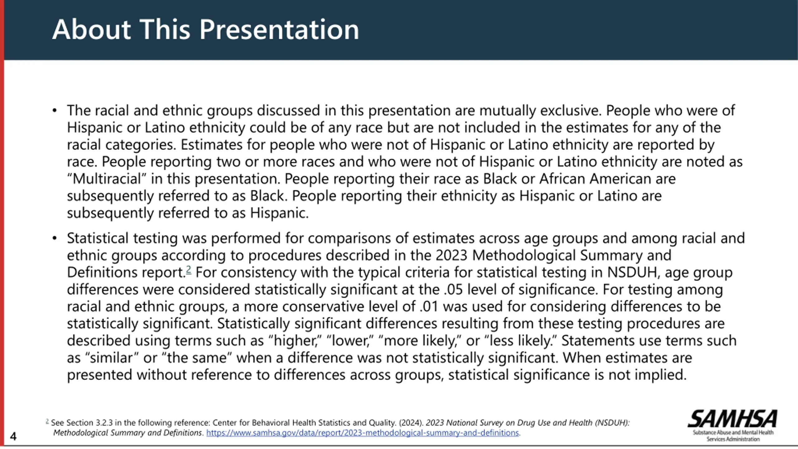 About This Presentation The racial and ethnic groups discussed in this presentation are mutually exclusive. People who were of Hispanic or Latino ethnicity could be of any race but are not included in the estimates for any of the racial categories. Estimates for people who were not of Hispanic or Latino ethnicity are reported by race. People reporting two or more races and who were not of Hispanic or Latino ethnicity are noted as Multiracial in this presentation. People reporting their race as Black or African American are subsequently referred to as Black. People reporting their ethnicity as Hispanic or Latino are subsequently referred to as Hispanic. Statistical testing was performed for comparisons of estimates across age groups and among racial and ethnic groups according to procedures described in the 2023 Methodological Summary and Definitions report.2 For consistency with the typical criteria for statistical testing in NSDUH, age group differences were considered statistically significant at the .05 level of significance. For testing among racial and ethnic groups, a more conservative level of .01 was used for considering differences to be statistically significant. Statistically significant differences resulting from these testing procedures are described using terms such as higher, lower, more likely, or less likely. Statements use terms such as similar or the same when a difference was not statistically significant. When estimates are presented without reference to differences across groups, statistical significance is not implied. 2 See Section 3.2.3 in the following reference: Center for Behavioral Health Statistics and Quality. (2024). 2023 National Survey on Drug Use and Health (NSDUH): Methodological Summary and Definitions. https://www.samhsa.gov/data/report/2023-methodological-summary-and-definitions. 4