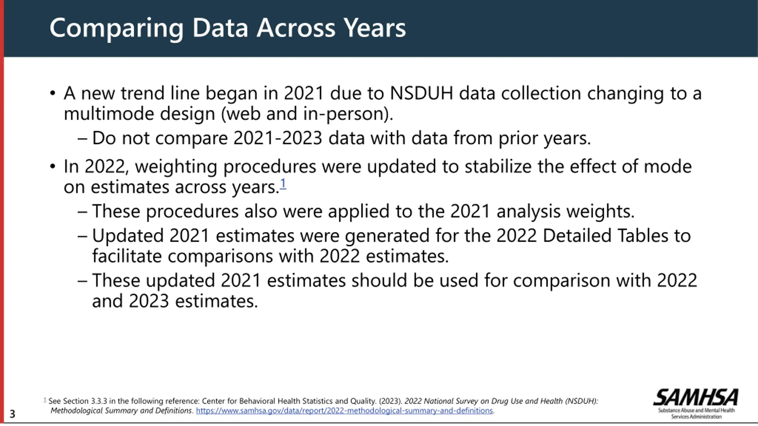 Comparing Data Across Years A new trend line began in 2021 due to NSDUH data collection changing to a multimode design (web and in-person). Do not compare 2021-2023 data with data from prior years. In 2022, weighting procedures were updated to stabilize the effect of mode on estimates across years.1 These procedures also were applied to the 2021 analysis weights. Updated 2021 estimates were generated for the 2022 Detailed Tables to facilitate comparisons with 2022 estimates. These updated 2021 estimates should be used for comparison with 2022 and 2023 estimates. 1 See Section 3.3.3 in the following reference: Center for Behavioral Health Statistics and Quality. (2023). 2022 National Survey on Drug Use and Health (NSDUH): Methodological Summary and Definitions. https://www.samhsa.gov/data/report/2022-methodological-summary-and-definitions. 3