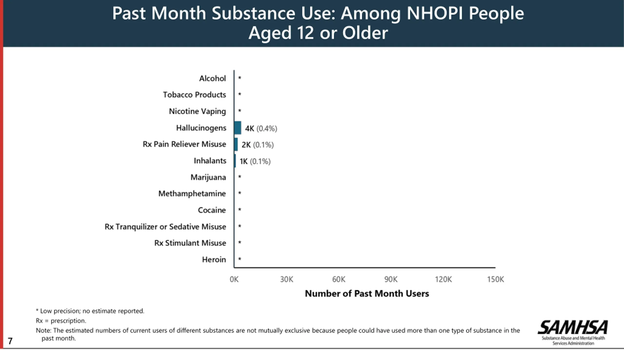 Past Month Substance Use: Among NHOPI People Aged 12 or Older * Low precision; no estimate reported. Rx = prescription. Note: The estimated numbers of current users of different substances are not mutually exclusive because people could have used more than one type of substance in the past month. 7
