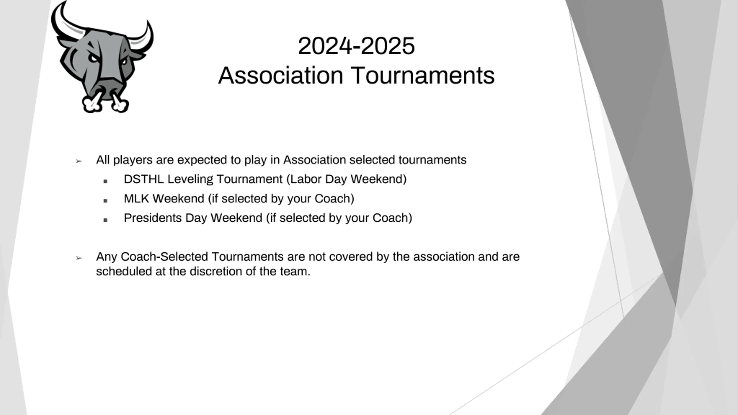 2024-2025 Association Tournaments All players are expected to play in Association selected tournaments DSTHL Leveling Tournament (Labor Day Weekend) MLK Weekend (if selected by your Coach) Presidents Day Weekend (if selected by your Coach) Any Coach-Selected Tournaments are not covered by the association and are scheduled at the discretion of the team.