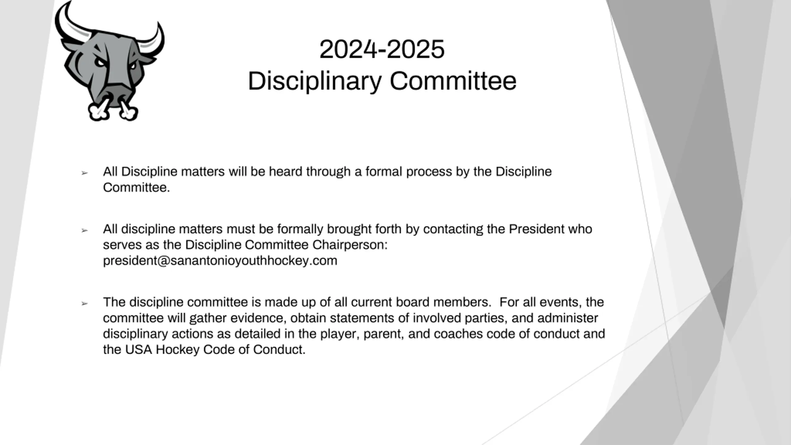 2024-2025 Disciplinary Committee All Discipline matters will be heard through a formal process by the Discipline Committee. All discipline matters must be formally brought forth by contacting the President who serves as the Discipline Committee Chairperson: president@sanantonioyouthhockey.com The discipline committee is made up of all current board members. For all events, the committee will gather evidence, obtain statements of involved parties, and administer disciplinary actions as detailed in the player, parent, and coaches code of conduct and the USA Hockey Code of Conduct.