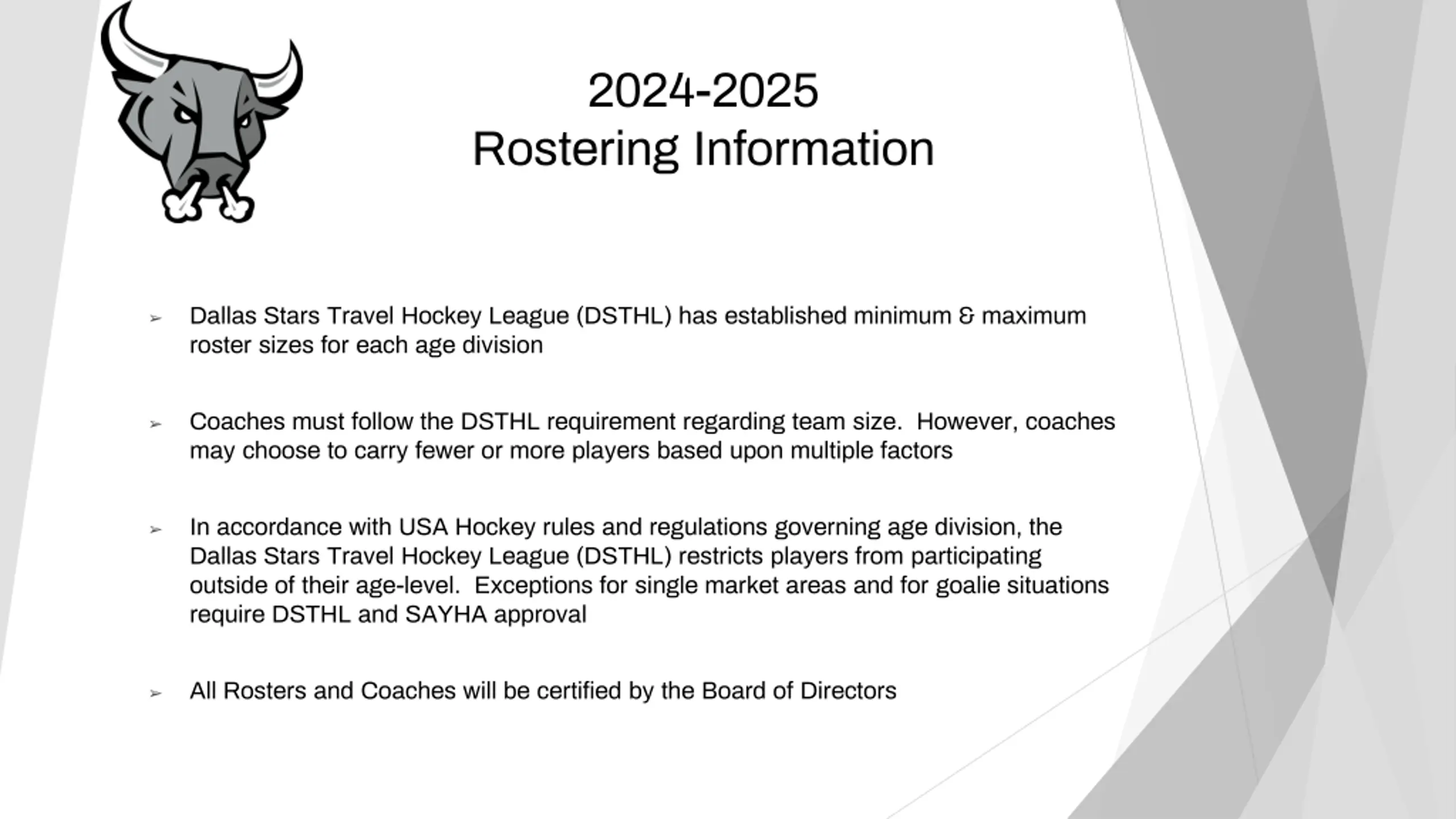 2024-2025 Rostering Information Dallas Stars Travel Hockey League (DSTHL) has established minimum & maximum roster sizes for each age division Coaches must follow the DSTHL requirement regarding team size. However, coaches may choose to carry fewer or more players based upon multiple factors In accordance with USA Hockey rules and regulations governing age division, the Dallas Stars Travel Hockey League (DSTHL) restricts players from participating outside of their age-level. Exceptions for single market areas and for goalie situations require DSTHL and SAYHA approval All Rosters and Coaches will be certified by the Board of Directors