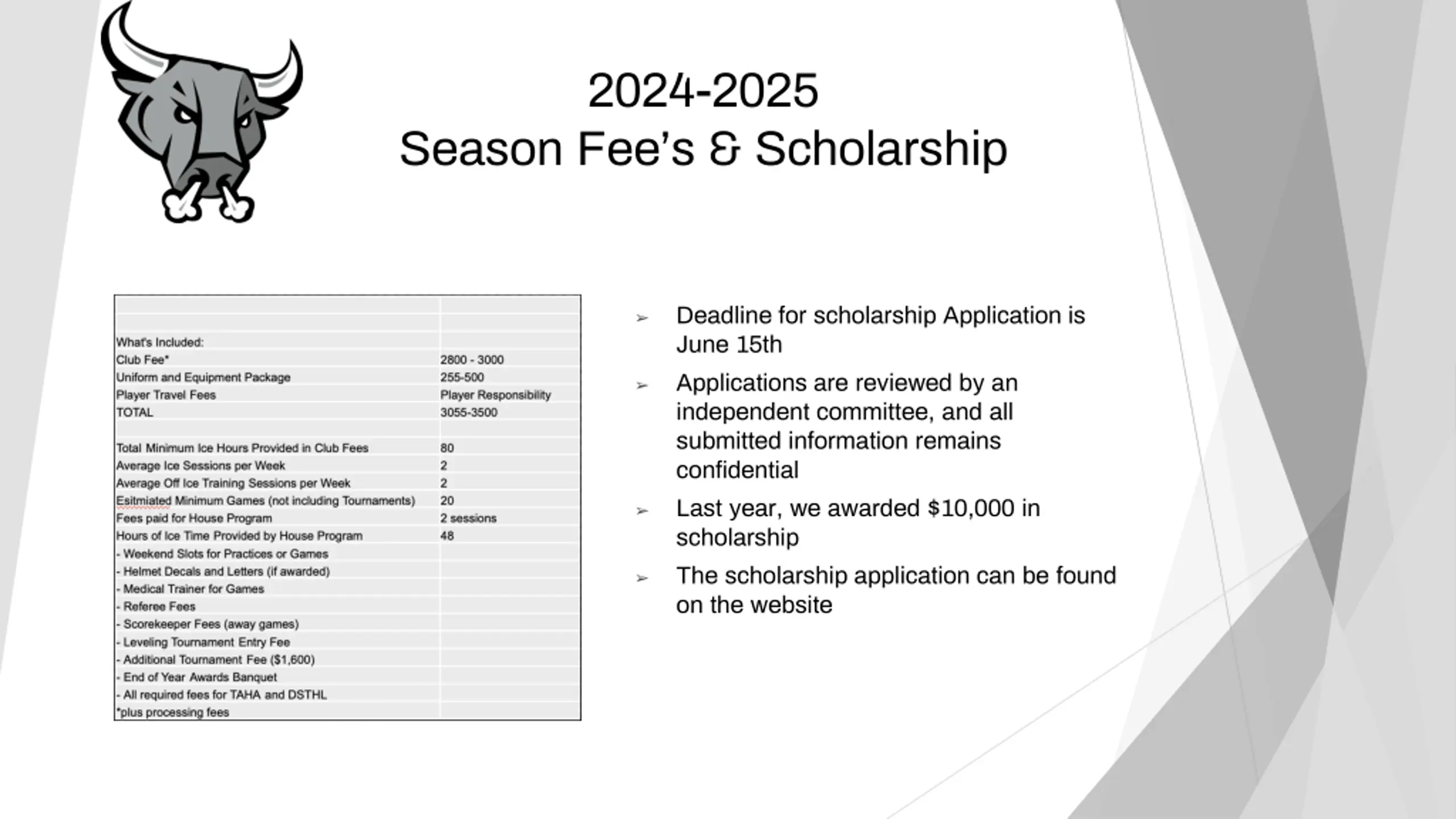 2024-2025 Season Fee s & Scholarship Deadline for scholarship Application is June 15th Applications are reviewed by an independent committee, and all submitted information remains confidential Last year, we awarded $10,000 in scholarship The scholarship application can be found on the website