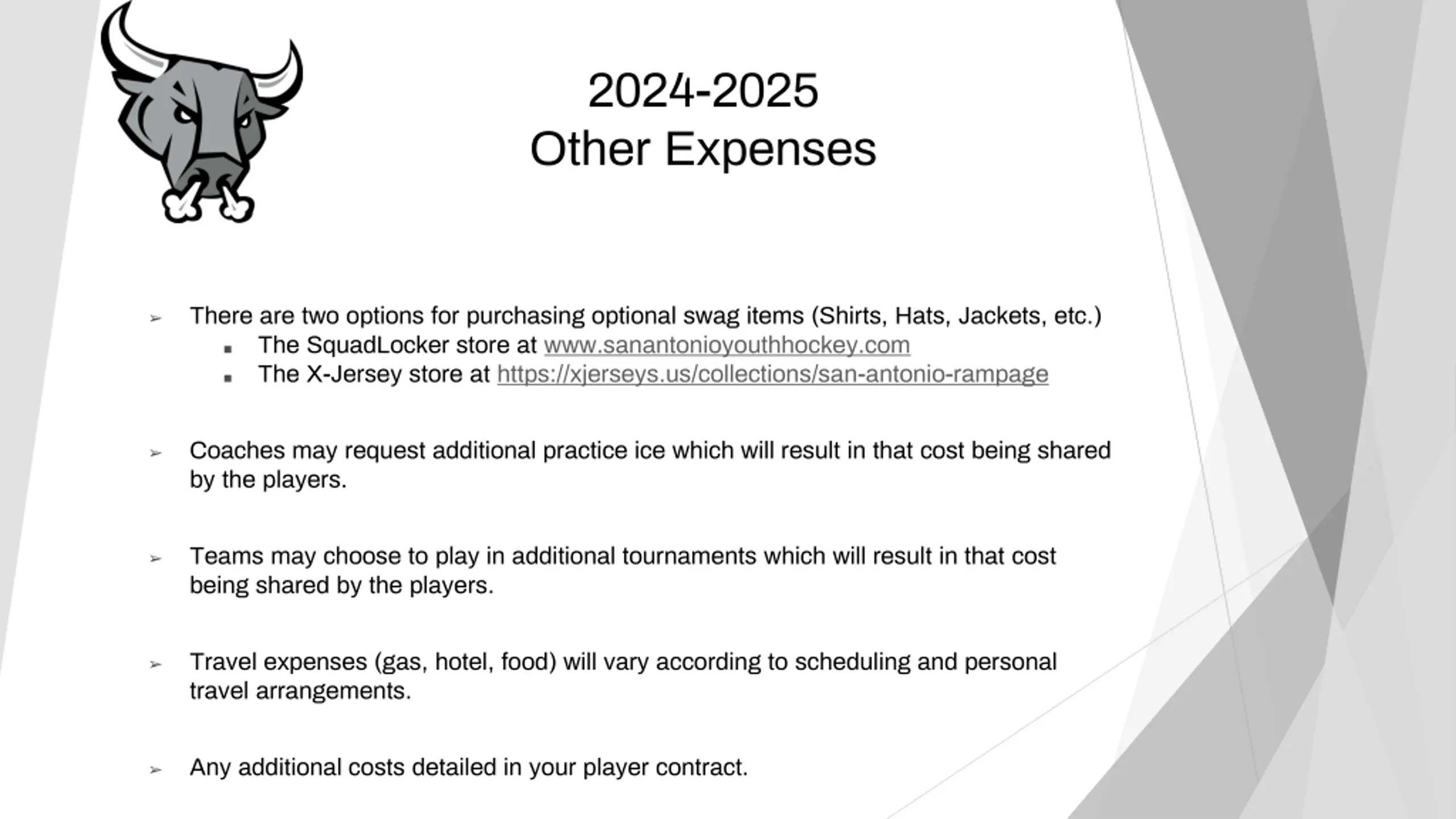 2024-2025 Other Expenses There are two options for purchasing optional swag items (Shirts, Hats, Jackets, etc.) The SquadLocker store at www.sanantonioyouthhockey.com The X-Jersey store at https://xjerseys.us/collections/san-antonio-rampage Coaches may request additional practice ice which will result in that cost being shared by the players. Teams may choose to play in additional tournaments which will result in that cost being shared by the players. Travel expenses (gas, hotel, food) will vary according to scheduling and personal travel arrangements. Any additional costs detailed in your player contract.