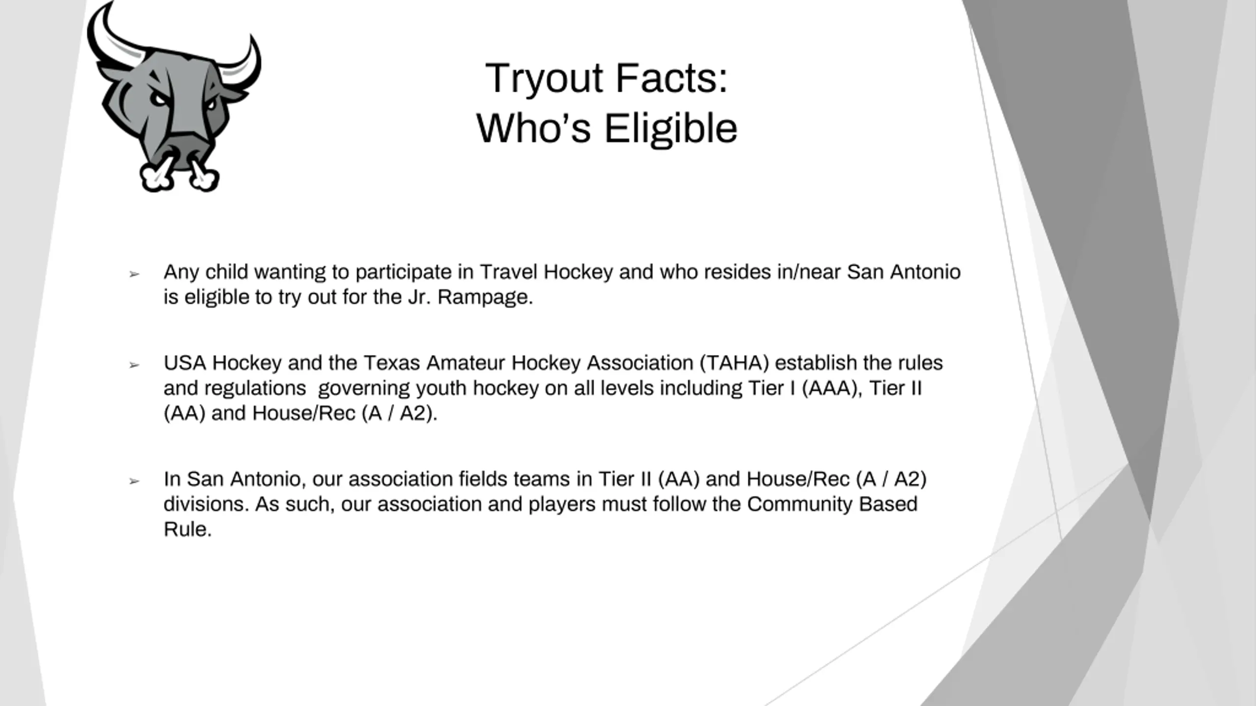 Tryout Facts: Who s Eligible Any child wanting to participate in Travel Hockey and who resides in/near San Antonio is eligible to try out for the Jr. Rampage. USA Hockey and the Texas Amateur Hockey Association (TAHA) establish the rules and regulations governing youth hockey on all levels including Tier I (AAA), Tier II (AA) and House/Rec (A / A2). In San Antonio, our association fields teams in Tier II (AA) and House/Rec (A / A2) divisions. As such, our association and players must follow the Community Based Rule.