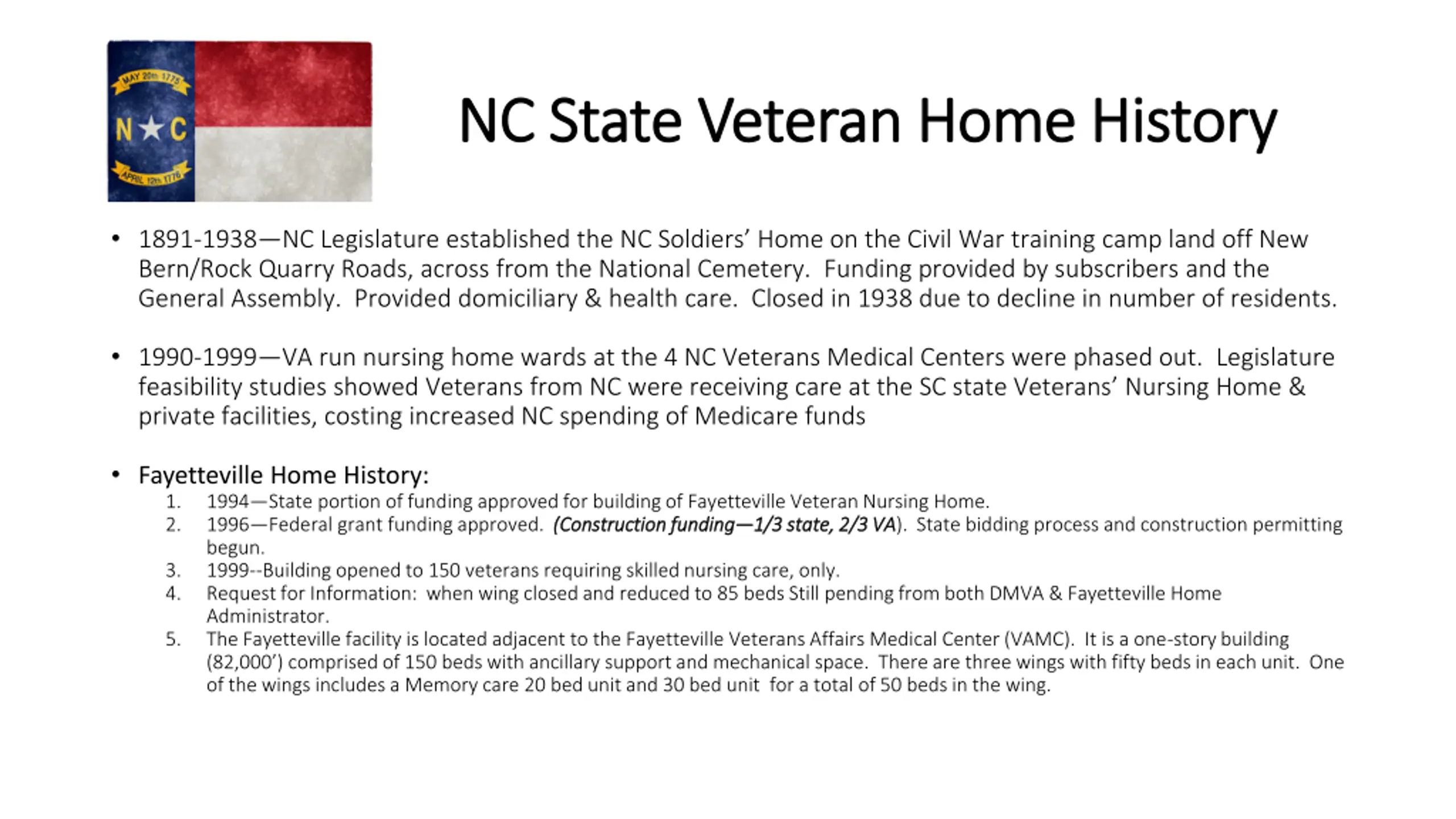 NC State Veteran Home History NC State Veteran Home History 1891-1938 NC Legislature established the NC Soldiers Home on the Civil War training camp land off New Bern/Rock Quarry Roads, across from the National Cemetery. Funding provided by subscribers and the General Assembly. Provided domiciliary & health care. Closed in 1938 due to decline in number of residents. 1990-1999 VA run nursing home wards at the 4 NC Veterans Medical Centers were phased out. Legislature feasibility studies showed Veterans from NC were receiving care at the SC state Veterans Nursing Home & private facilities, costing increased NC spending of Medicare funds Fayetteville Home History: 1. 1994 State portion of funding approved for building of Fayetteville Veteran Nursing Home. 2. 1996 Federal grant funding approved. (Construction funding begun. 3. 1999--Building opened to 150 veterans requiring skilled nursing care, only. 4. Request for Information: when wing closed and reduced to 85 beds Still pending from both DMVA & Fayetteville Home Administrator. 5. The Fayetteville facility is located adjacent to the Fayetteville Veterans Affairs Medical Center (VAMC). It is a one-story building (82,000 ) comprised of 150 beds with ancillary support and mechanical space. There are three wings with fifty beds in each unit. One of the wings includes a Memory care 20 bed unit and 30 bed unit for a total of 50 beds in the wing. (Construction funding 1/3 state, 2/3 VA 1/3 state, 2/3 VA). State bidding process and construction permitting