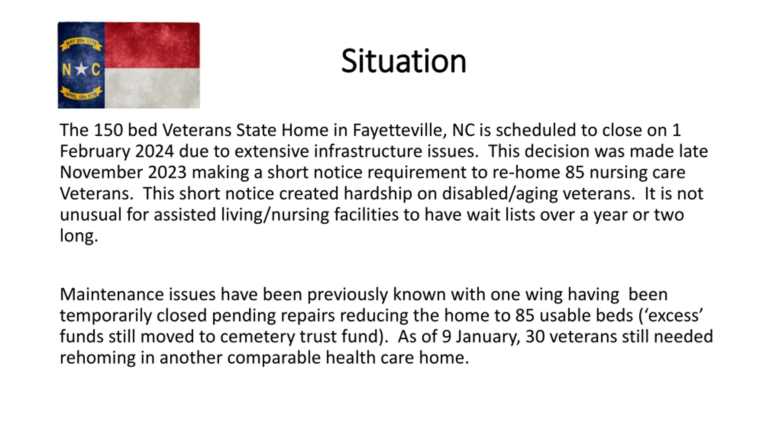 Situation Situation The 150 bed Veterans State Home in Fayetteville, NC is scheduled to close on 1 February 2024 due to extensive infrastructure issues. This decision was made late November 2023 making a short notice requirement to re-home 85 nursing care Veterans. This short notice created hardship on disabled/aging veterans. It is not unusual for assisted living/nursing facilities to have wait lists over a year or two long. Maintenance issues have been previously known with one wing having been temporarily closed pending repairs reducing the home to 85 usable beds ( excess funds still moved to cemetery trust fund). As of 9 January, 30 veterans still needed rehoming in another comparable health care home.