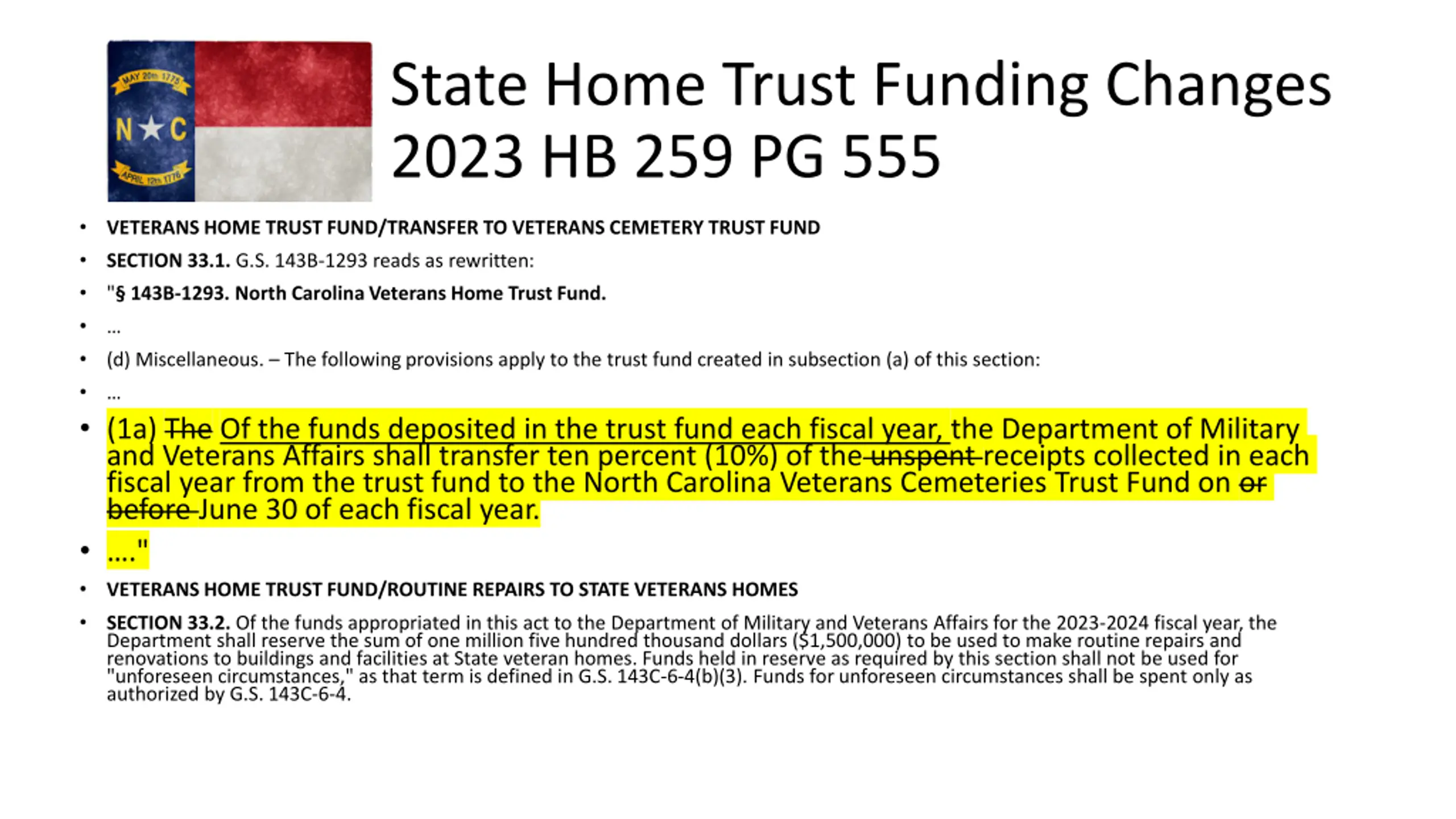 State Home Trust Funding Changes 2023 HB 259 PG 555 (1a) The Of the funds deposited in the trust fund each fiscal year, the Department of Military and Veterans Affairs shall transfer ten percent (10%) of the unspent receipts collected in each fiscal year from the trust fund to the North Carolina Veterans Cemeteries Trust Fund on or before June 30 of each fiscal year. ." VETERANS HOME TRUST FUND/ROUTINE REPAIRS TO STATE VETERANS HOMES SECTION 33.2. Of the funds appropriated in this act to the Department of Military and Veterans Affairs for the 2023-2024 fiscal year, the Department shall reserve the sum of one million five hundred thousand dollars ($1,500,000) to be used to make routine repairs and renovations to buildings and facilities at State veteran homes. Funds held in reserve as required by this section shall not be used for "unforeseen circumstances," as that term is defined in G.S. 143C-6-4(b)(3). Funds for unforeseen circumstances shall be spent only as authorized by G.S. 143C-6-4. VETERANS HOME TRUST FUND/TRANSFER TO VETERANS CEMETERY TRUST FUND SECTION 33.1. G.S. 143B-1293 reads as rewritten: " 143B-1293. North Carolina Veterans Home Trust Fund. (d) Miscellaneous. The following provisions apply to the trust fund created in subsection (a) of this section: