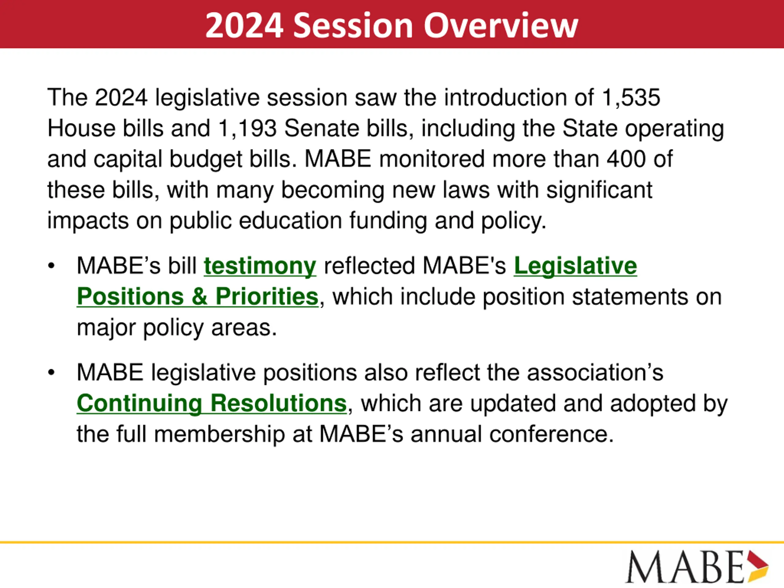 2024 Session Overview The 2024 legislative session saw the introduction of 1,535 House bills and 1,193 Senate bills, including the State operating and capital budget bills. MABE monitored more than 400 of these bills, with many becoming new laws with significant impacts on public education funding and policy. MABE s bill testimony reflected MABE's Legislative Positions & Priorities, which include position statements on major policy areas. MABE legislative positions also reflect the association s Continuing Resolutions, which are updated and adopted by the full membership at MABE s annual conference.