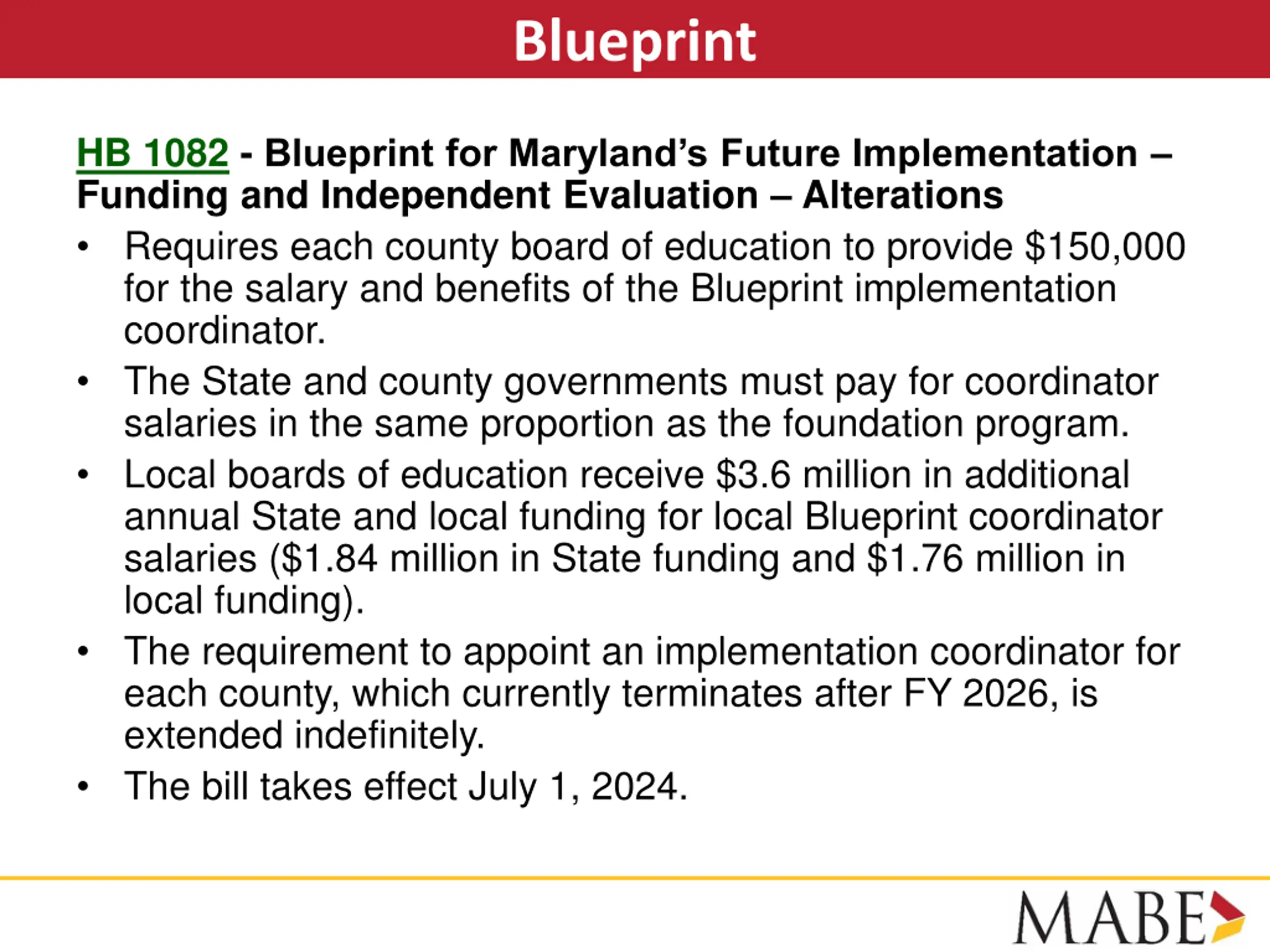Blueprint HB 1082 - Blueprint for Maryland s Future Implementation Funding and Independent Evaluation Alterations Requires each county board of education to provide $150,000 for the salary and benefits of the Blueprint implementation coordinator. The State and county governments must pay for coordinator salaries in the same proportion as the foundation program. Local boards of education receive $3.6 million in additional annual State and local funding for local Blueprint coordinator salaries ($1.84 million in State funding and $1.76 million in local funding). The requirement to appoint an implementation coordinator for each county, which currently terminates after FY 2026, is extended indefinitely. The bill takes effect July 1, 2024.