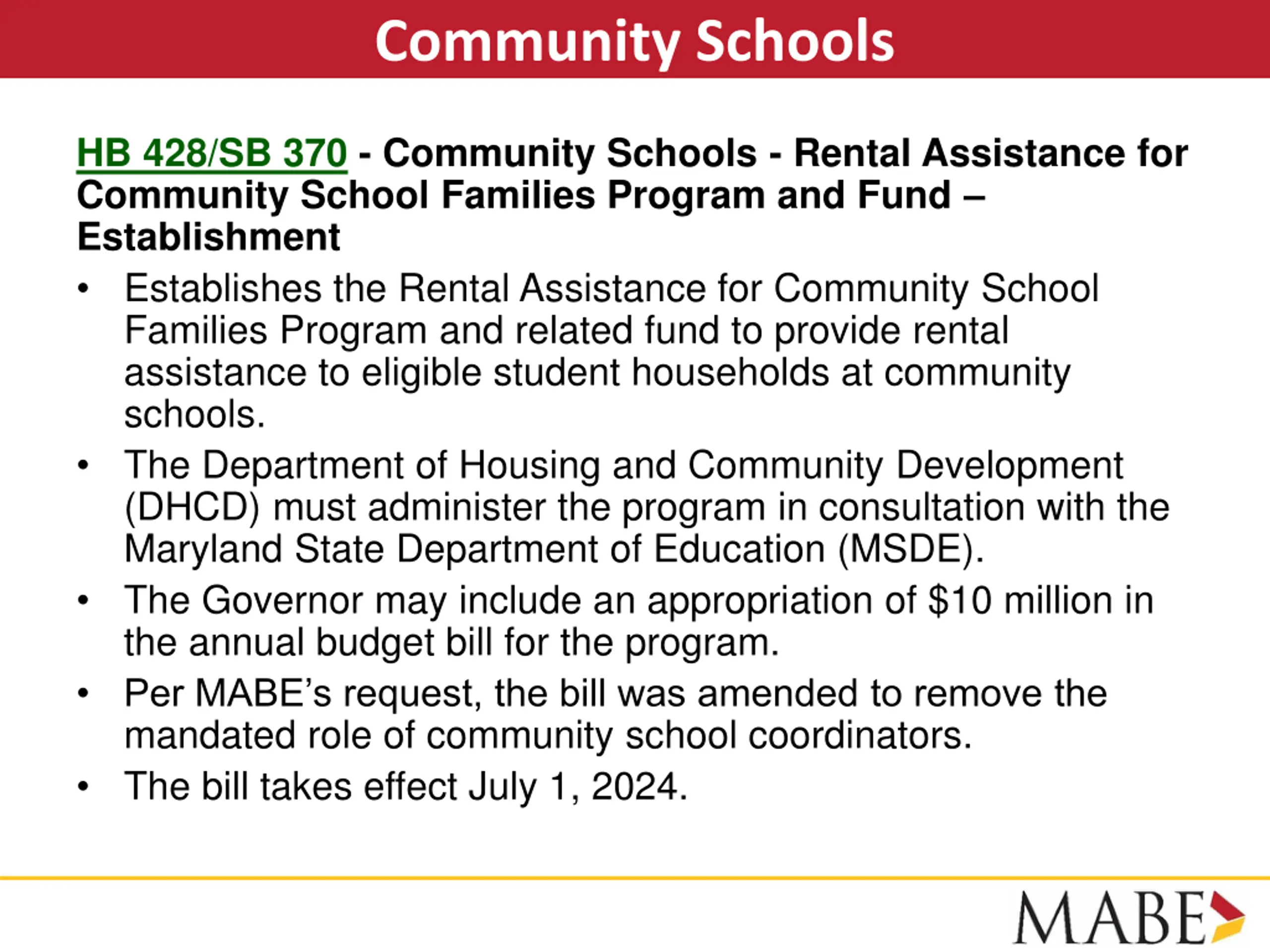 Community Schools HB 428/SB 370 - Community Schools - Rental Assistance for Community School Families Program and Fund Establishment Establishes the Rental Assistance for Community School Families Program and related fund to provide rental assistance to eligible student households at community schools. The Department of Housing and Community Development (DHCD) must administer the program in consultation with the Maryland State Department of Education (MSDE). The Governor may include an appropriation of $10 million in the annual budget bill for the program. Per MABE s request, the bill was amended to remove the mandated role of community school coordinators. The bill takes effect July 1, 2024.