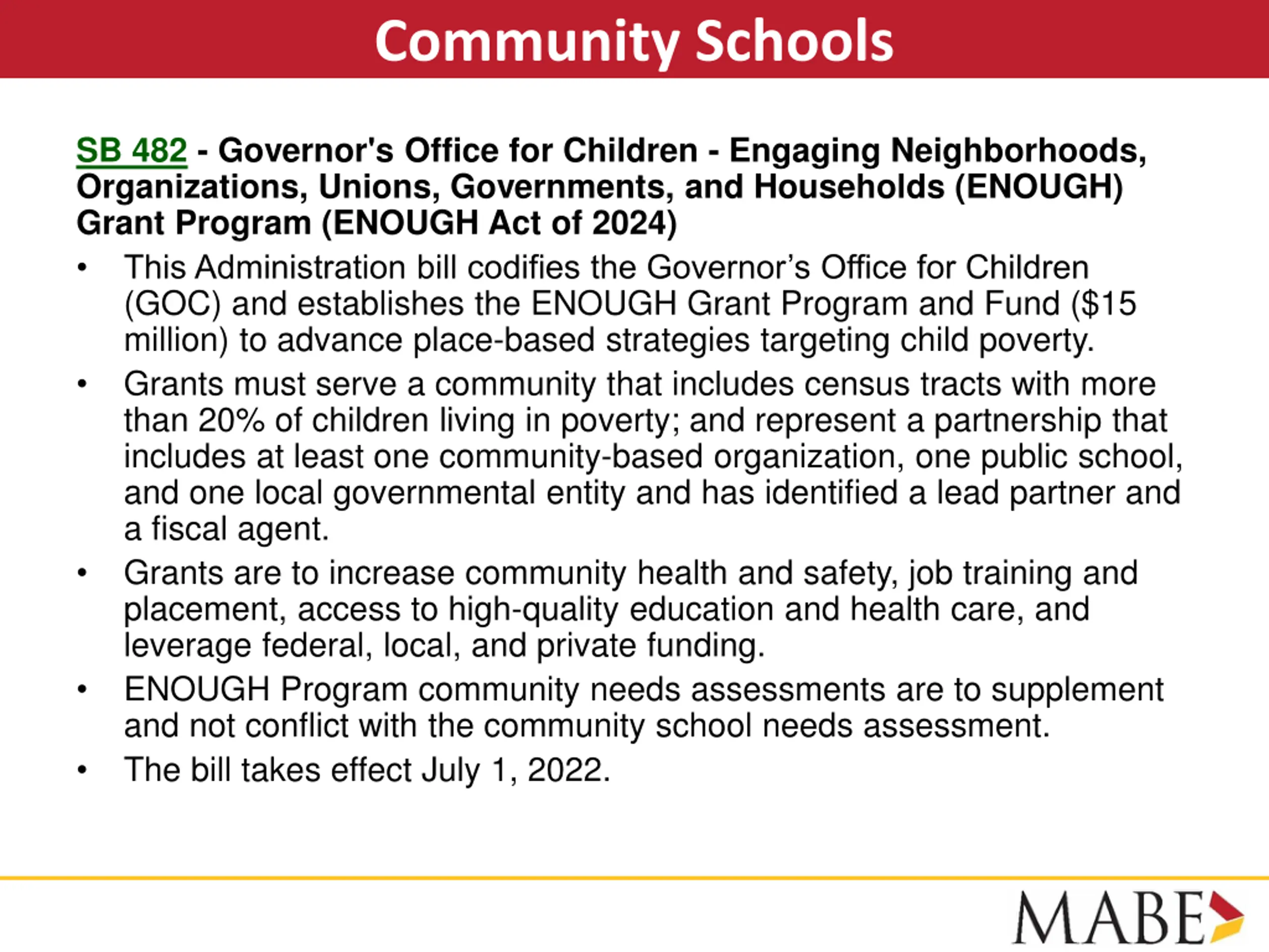Community Schools SB 482 - Governor's Office for Children - Engaging Neighborhoods, Organizations, Unions, Governments, and Households (ENOUGH) Grant Program (ENOUGH Act of 2024) This Administration bill codifies the Governor s Office for Children (GOC) and establishes the ENOUGH Grant Program and Fund ($15 million) to advance place-based strategies targeting child poverty. Grants must serve a community that includes census tracts with more than 20% of children living in poverty; and represent a partnership that includes at least one community-based organization, one public school, and one local governmental entity and has identified a lead partner and a fiscal agent. Grants are to increase community health and safety, job training and placement, access to high-quality education and health care, and leverage federal, local, and private funding. ENOUGH Program community needs assessments are to supplement and not conflict with the community school needs assessment. The bill takes effect July 1, 2022.