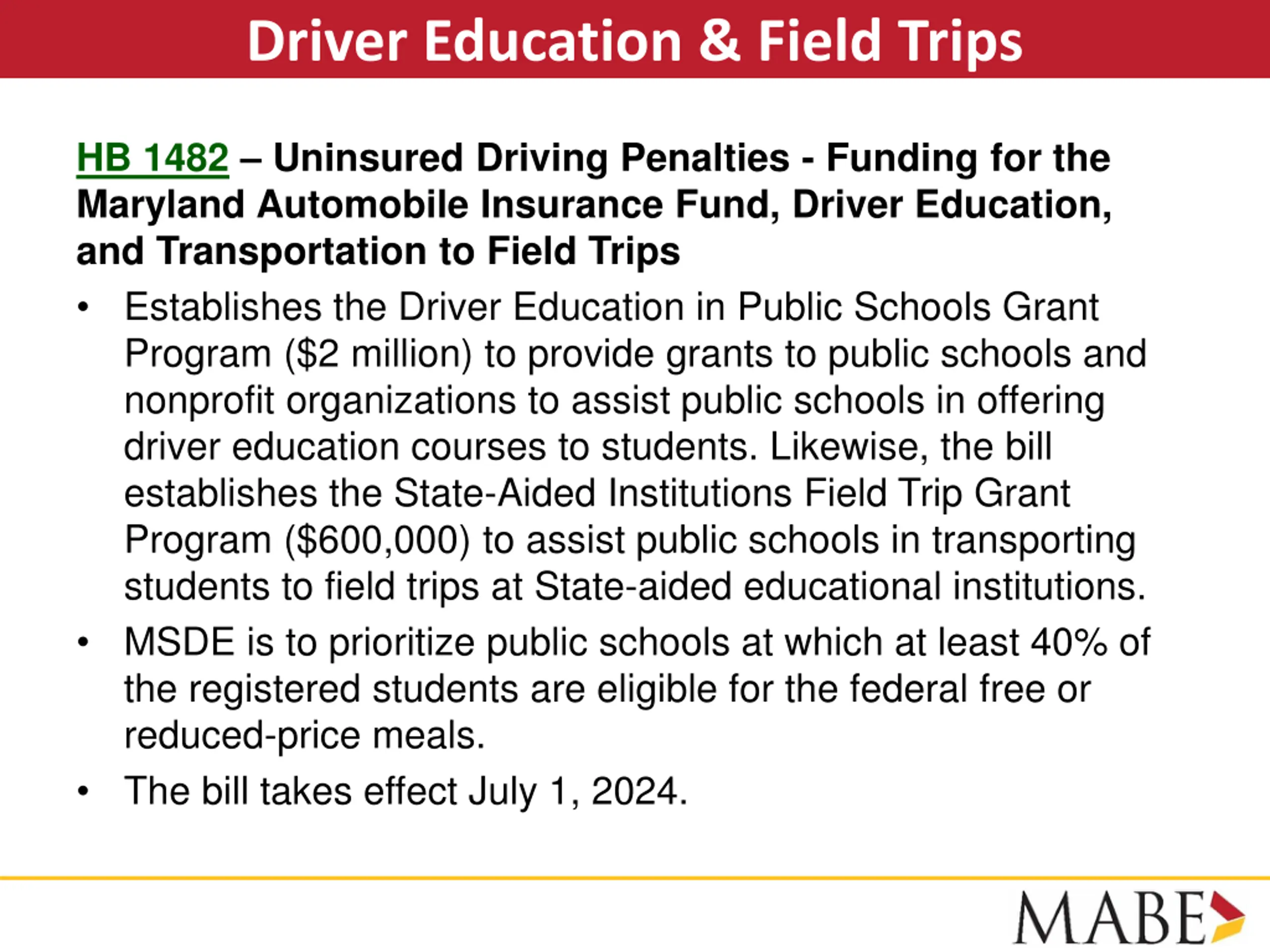 Driver Education & Field Trips HB 1482 Uninsured Driving Penalties - Funding for the Maryland Automobile Insurance Fund, Driver Education, and Transportation to Field Trips Establishes the Driver Education in Public Schools Grant Program ($2 million) to provide grants to public schools and nonprofit organizations to assist public schools in offering driver education courses to students. Likewise, the bill establishes the State-Aided Institutions Field Trip Grant Program ($600,000) to assist public schools in transporting students to field trips at State-aided educational institutions. MSDE is to prioritize public schools at which at least 40% of the registered students are eligible for the federal free or reduced-price meals. The bill takes effect July 1, 2024.