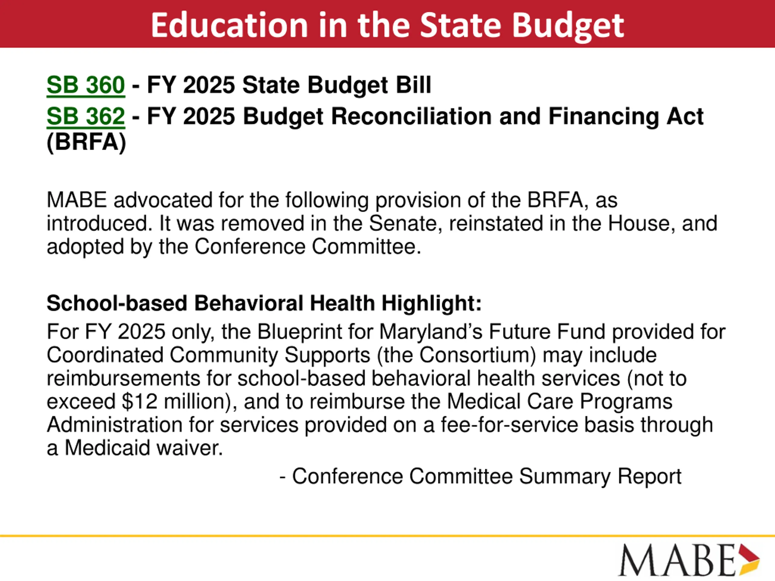Education in the State Budget SB 360 - FY 2025 State Budget Bill SB 362 - FY 2025 Budget Reconciliation and Financing Act (BRFA) MABE advocated for the following provision of the BRFA, as introduced. It was removed in the Senate, reinstated in the House, and adopted by the Conference Committee. School-based Behavioral Health Highlight: For FY 2025 only, the Blueprint for Maryland s Future Fund provided for Coordinated Community Supports (the Consortium) may include reimbursements for school-based behavioral health services (not to exceed $12 million), and to reimburse the Medical Care Programs Administration for services provided on a fee-for-service basis through a Medicaid waiver. - Conference Committee Summary Report