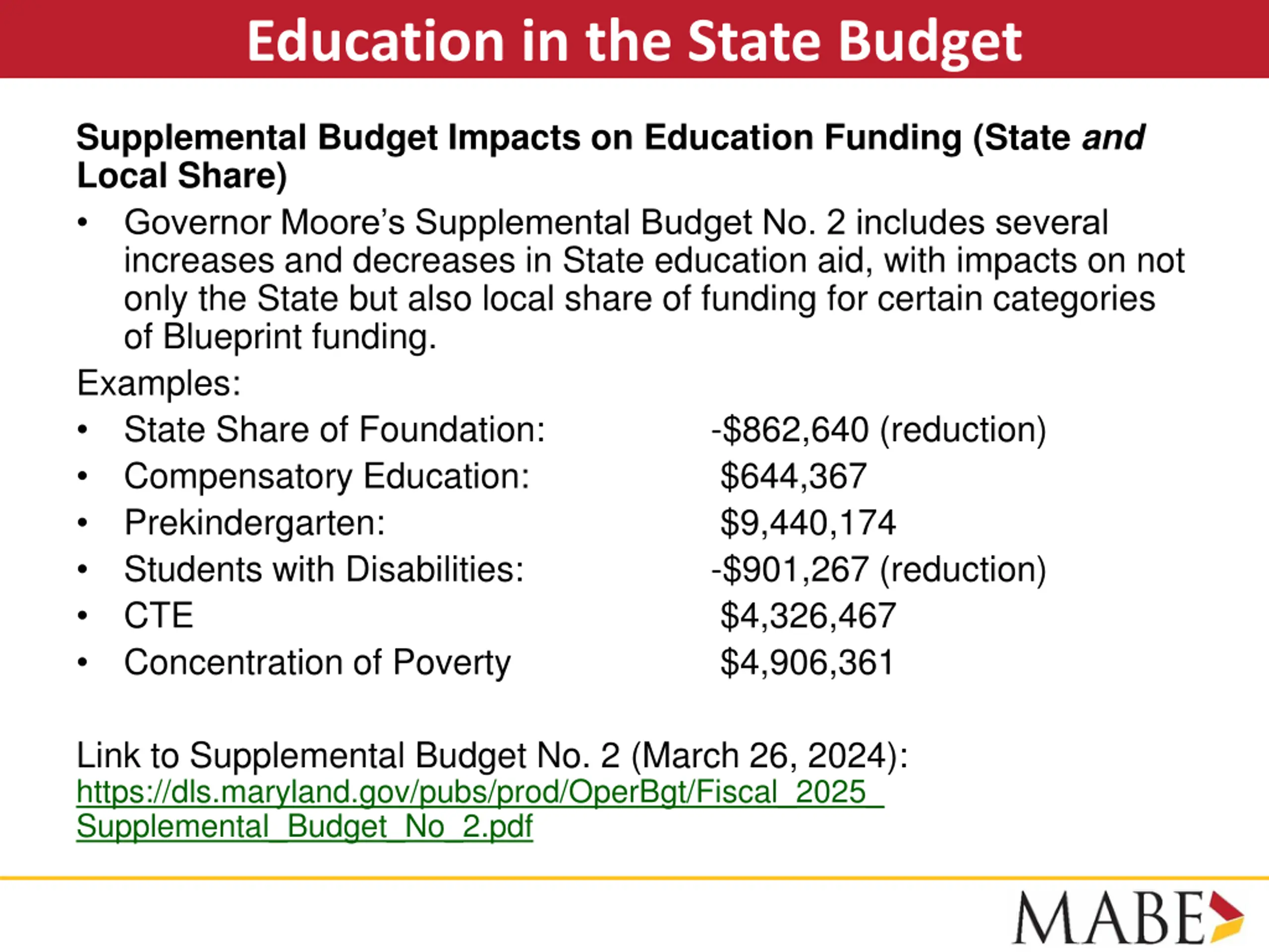 Education in the State Budget Supplemental Budget Impacts on Education Funding (State and Local Share) Governor Moore s Supplemental Budget No. 2 includes several increases and decreases in State education aid, with impacts on not only the State but also local share of funding for certain categories of Blueprint funding. Examples: State Share of Foundation: Compensatory Education: Prekindergarten: Students with Disabilities: CTE Concentration of Poverty -$862,640 (reduction) $644,367 $9,440,174 -$901,267 (reduction) $4,326,467 $4,906,361 Link to Supplemental Budget No. 2 (March 26, 2024): https://dls.maryland.gov/pubs/prod/OperBgt/Fiscal_2025_ Supplemental_Budget_No_2.pdf
