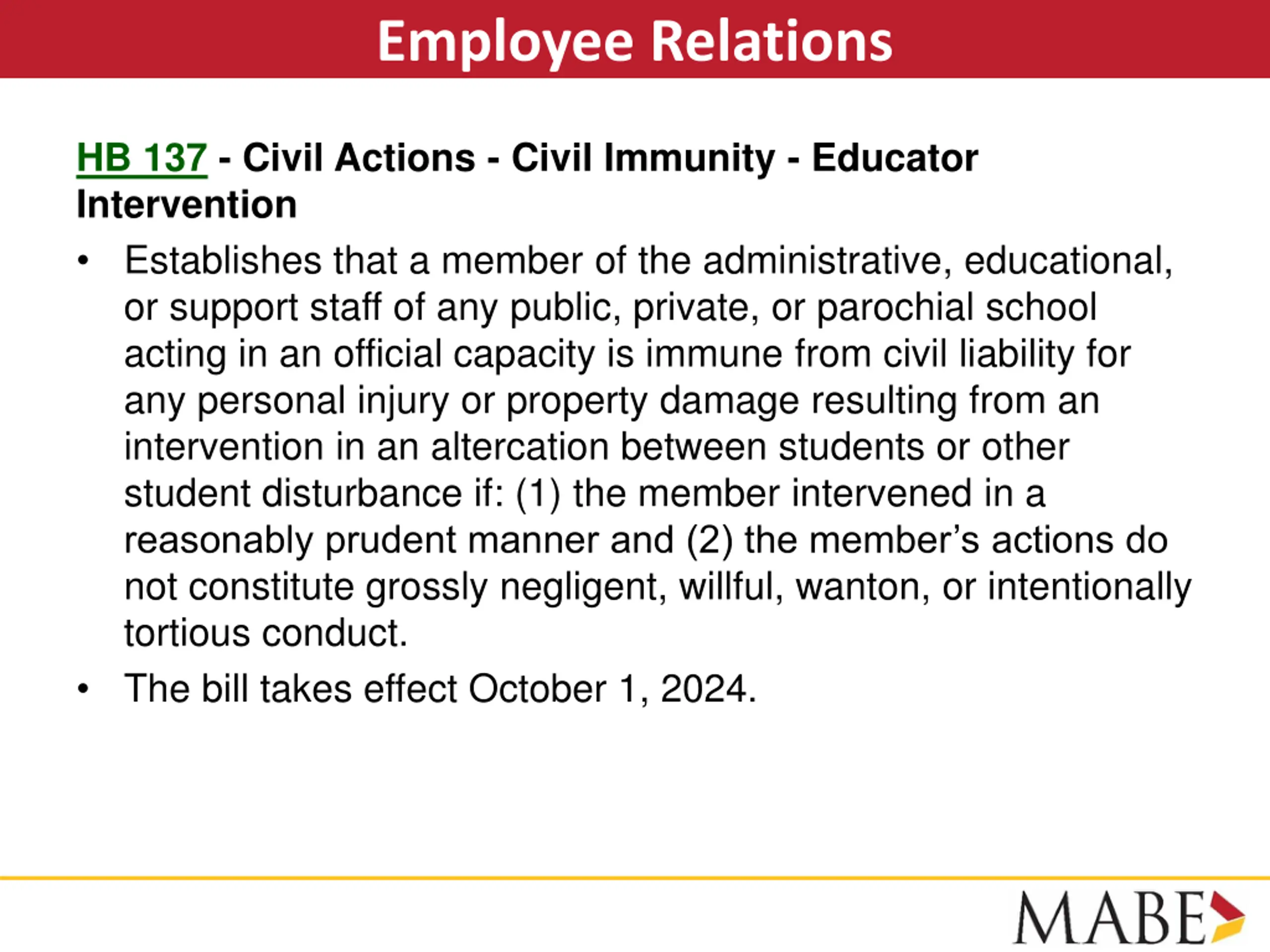 Employee Relations HB 137 - Civil Actions - Civil Immunity - Educator Intervention Establishes that a member of the administrative, educational, or support staff of any public, private, or parochial school acting in an official capacity is immune from civil liability for any personal injury or property damage resulting from an intervention in an altercation between students or other student disturbance if: (1) the member intervened in a reasonably prudent manner and (2) the member s actions do not constitute grossly negligent, willful, wanton, or intentionally tortious conduct. The bill takes effect October 1, 2024.