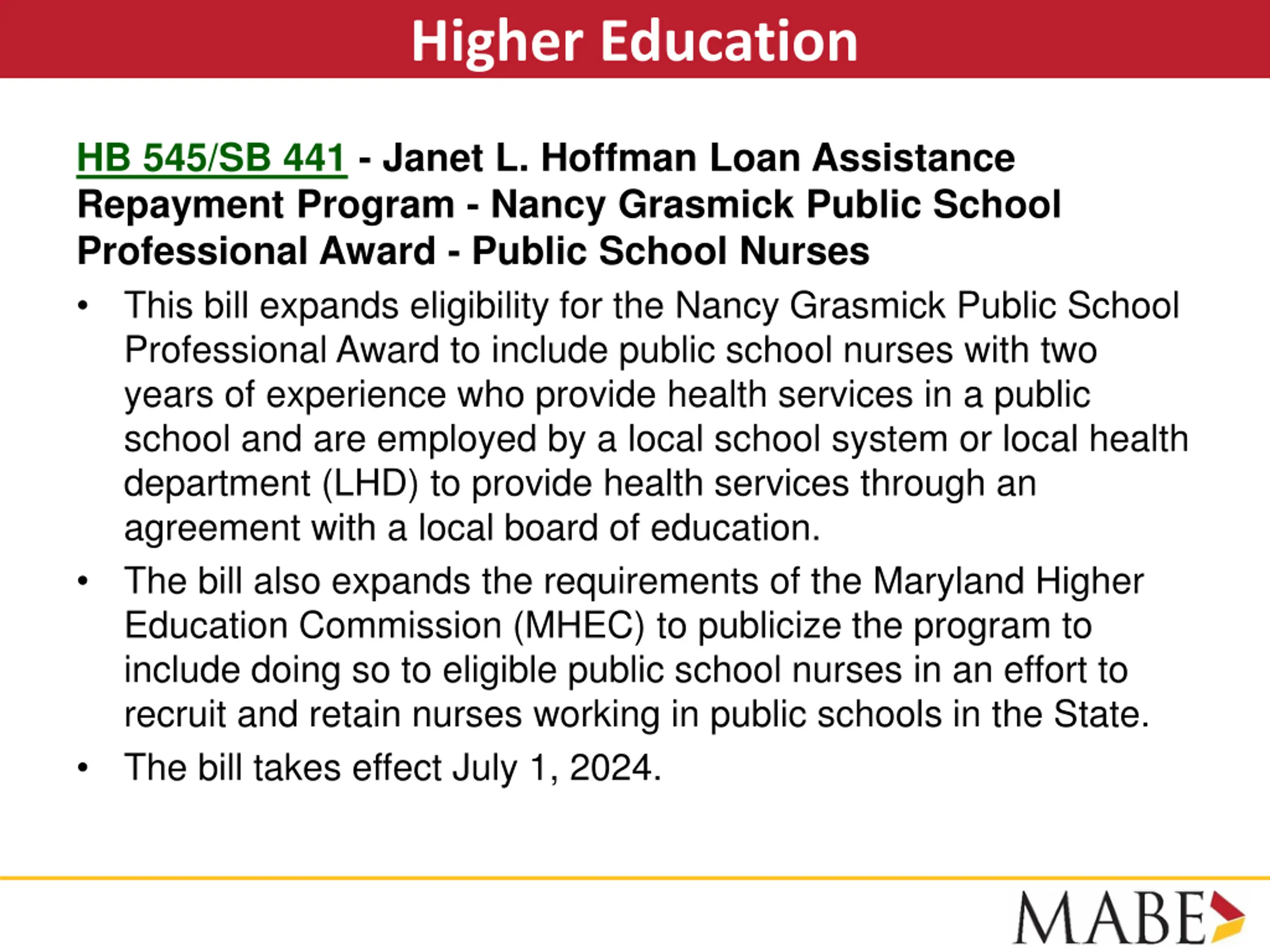 Higher Education HB 545/SB 441 - Janet L. Hoffman Loan Assistance Repayment Program - Nancy Grasmick Public School Professional Award - Public School Nurses This bill expands eligibility for the Nancy Grasmick Public School Professional Award to include public school nurses with two years of experience who provide health services in a public school and are employed by a local school system or local health department (LHD) to provide health services through an agreement with a local board of education. The bill also expands the requirements of the Maryland Higher Education Commission (MHEC) to publicize the program to include doing so to eligible public school nurses in an effort to recruit and retain nurses working in public schools in the State. The bill takes effect July 1, 2024.
