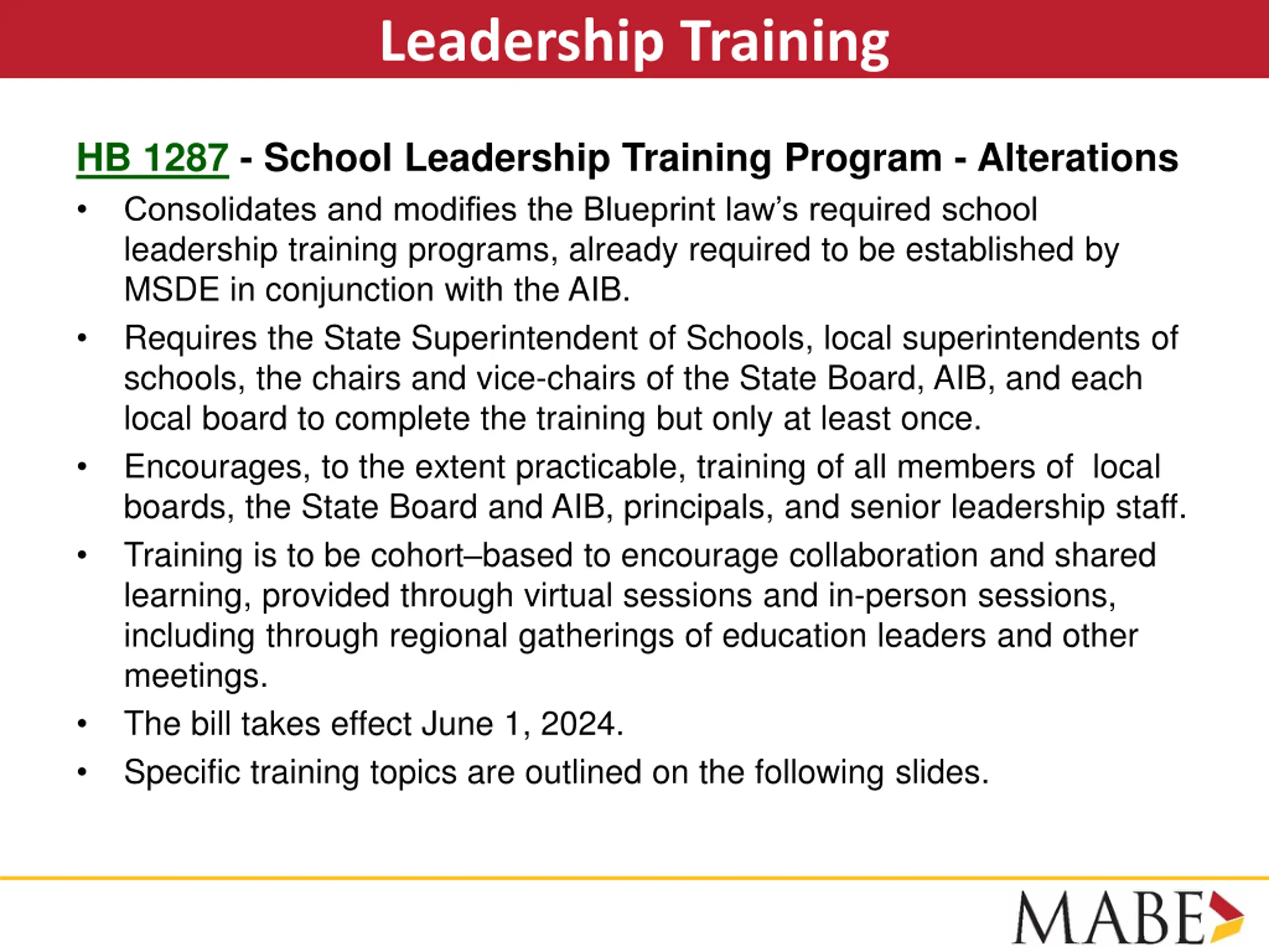 Leadership Training HB 1287 - School Leadership Training Program - Alterations Consolidates and modifies the Blueprint law s required school leadership training programs, already required to be established by MSDE in conjunction with the AIB. Requires the State Superintendent of Schools, local superintendents of schools, the chairs and vice-chairs of the State Board, AIB, and each local board to complete the training but only at least once. Encourages, to the extent practicable, training of all members of local boards, the State Board and AIB, principals, and senior leadership staff. Training is to be cohort based to encourage collaboration and shared learning, provided through virtual sessions and in-person sessions, including through regional gatherings of education leaders and other meetings. The bill takes effect June 1, 2024. Specific training topics are outlined on the following slides.
