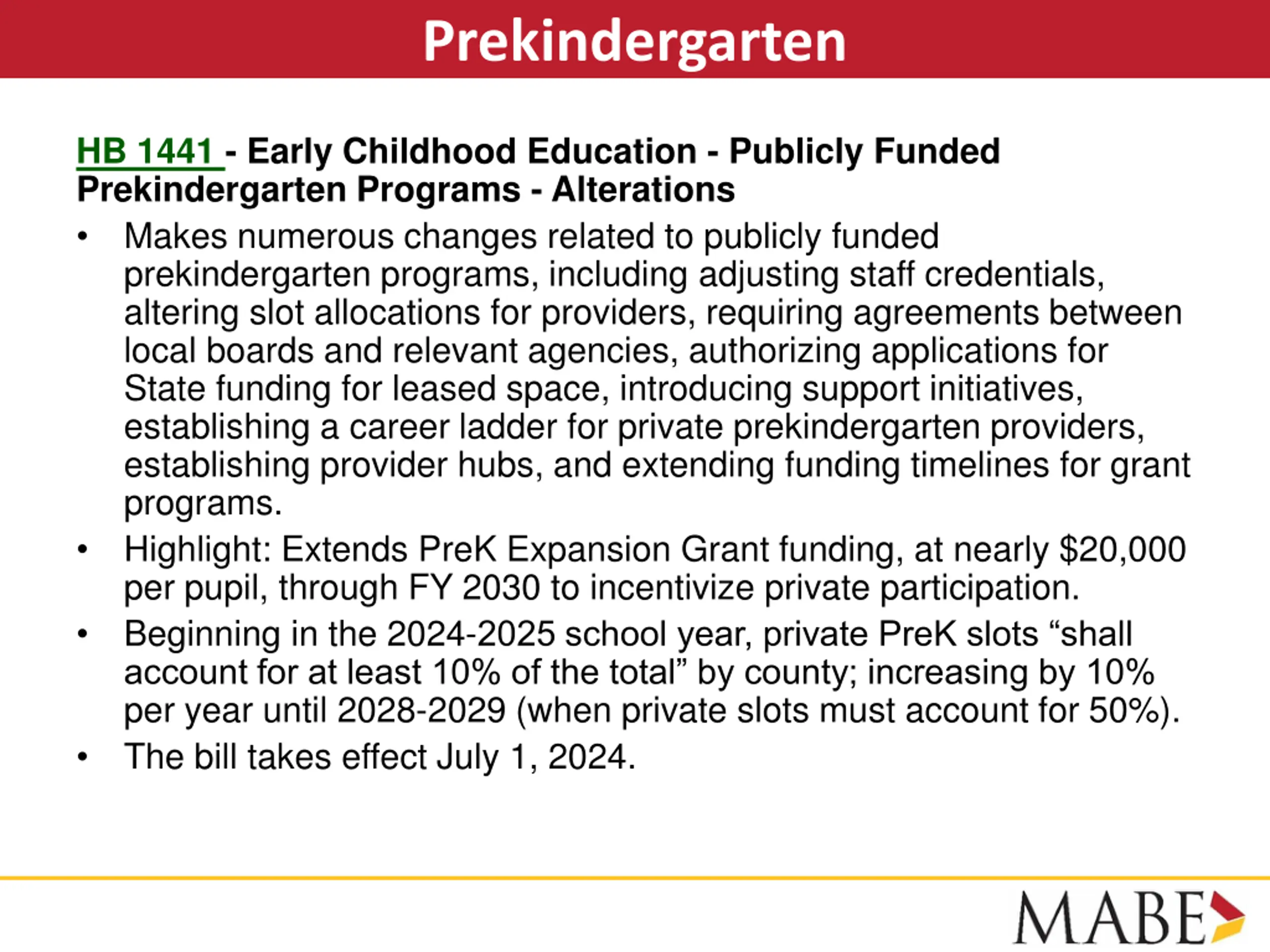 Prekindergarten HB 1441 - Early Childhood Education - Publicly Funded Prekindergarten Programs - Alterations Makes numerous changes related to publicly funded prekindergarten programs, including adjusting staff credentials, altering slot allocations for providers, requiring agreements between local boards and relevant agencies, authorizing applications for State funding for leased space, introducing support initiatives, establishing a career ladder for private prekindergarten providers, establishing provider hubs, and extending funding timelines for grant programs. Highlight: Extends PreK Expansion Grant funding, at nearly $20,000 per pupil, through FY 2030 to incentivize private participation. Beginning in the 2024-2025 school year, private PreK slots shall account for at least 10% of the total by county; increasing by 10% per year until 2028-2029 (when private slots must account for 50%). The bill takes effect July 1, 2024.